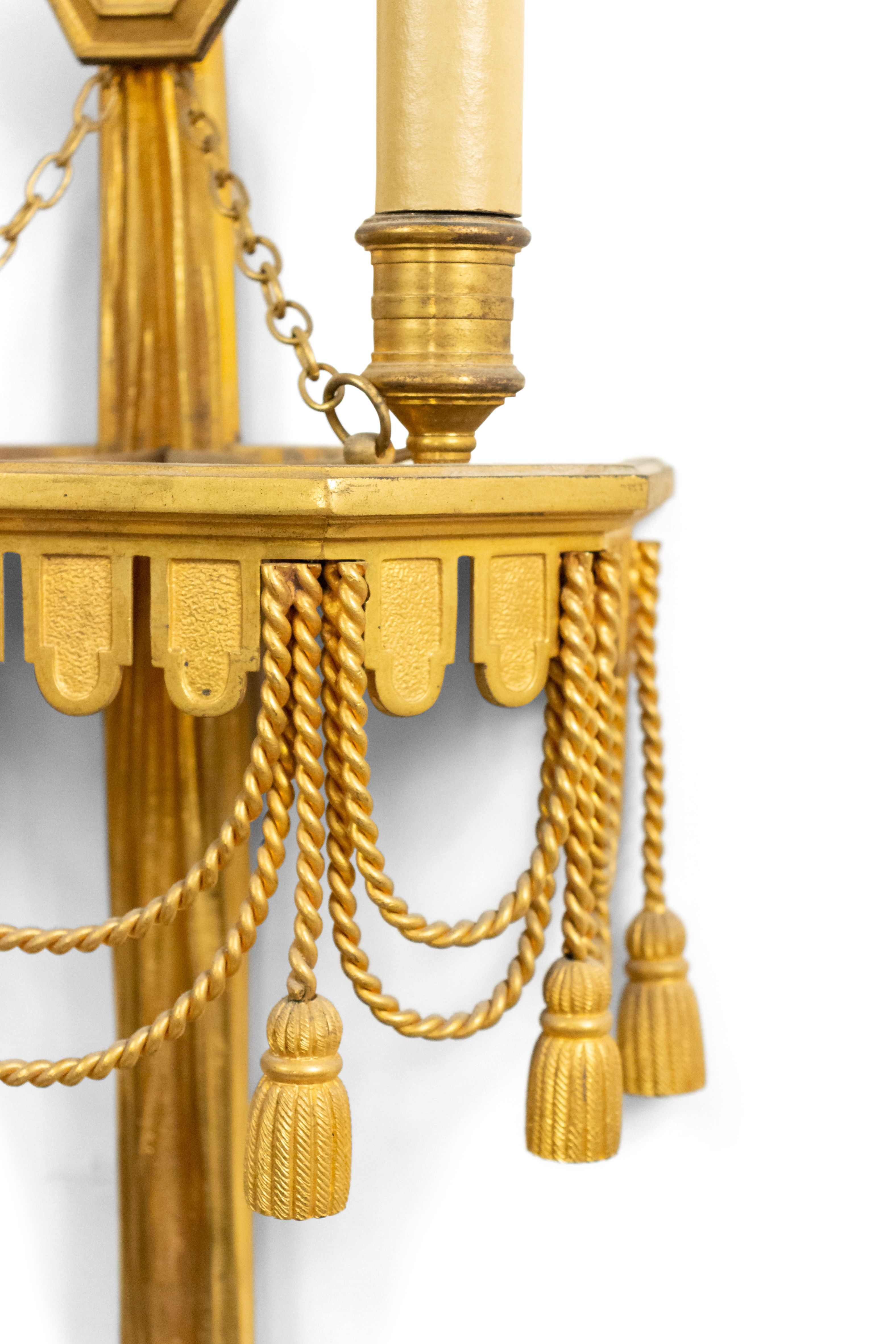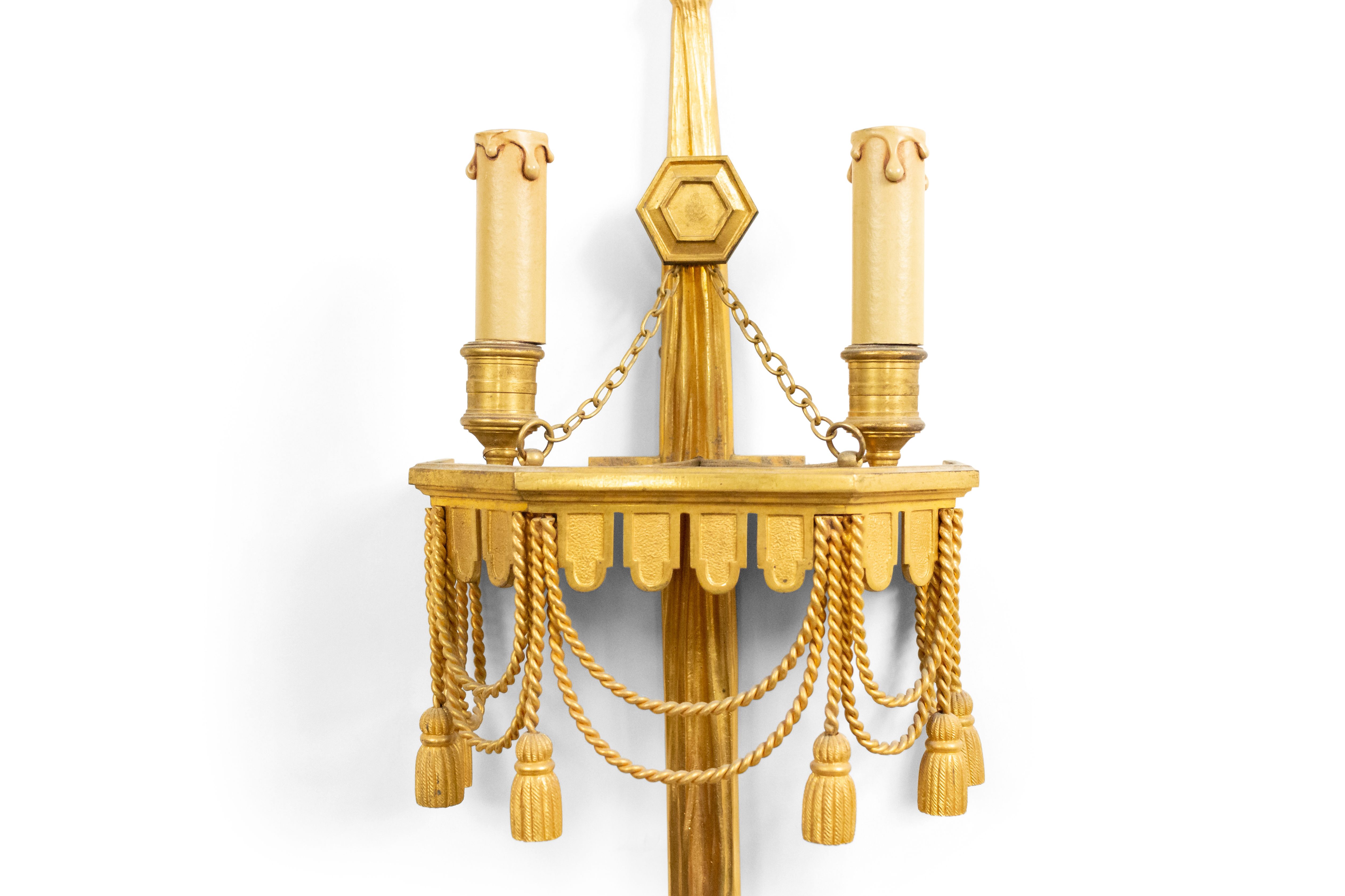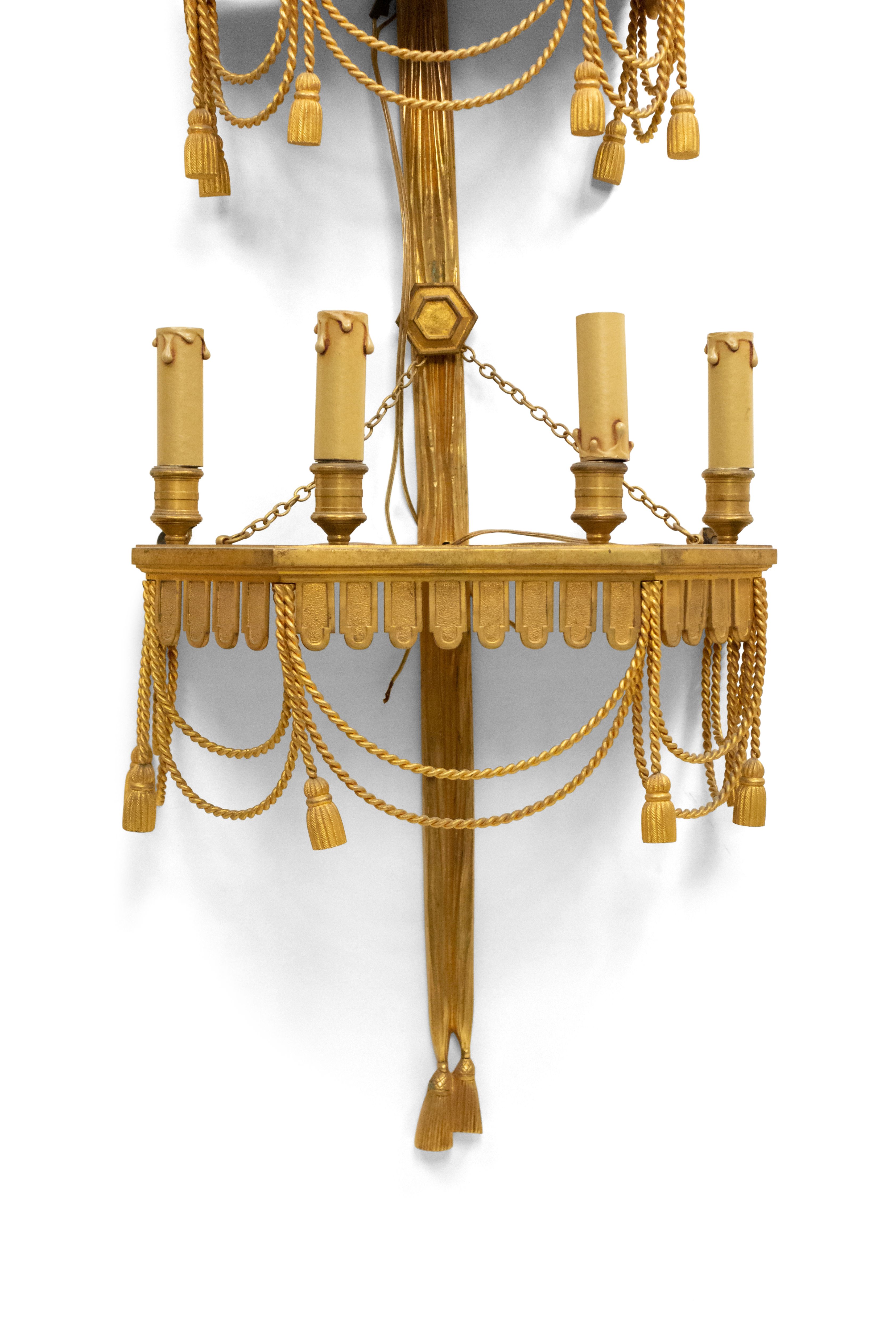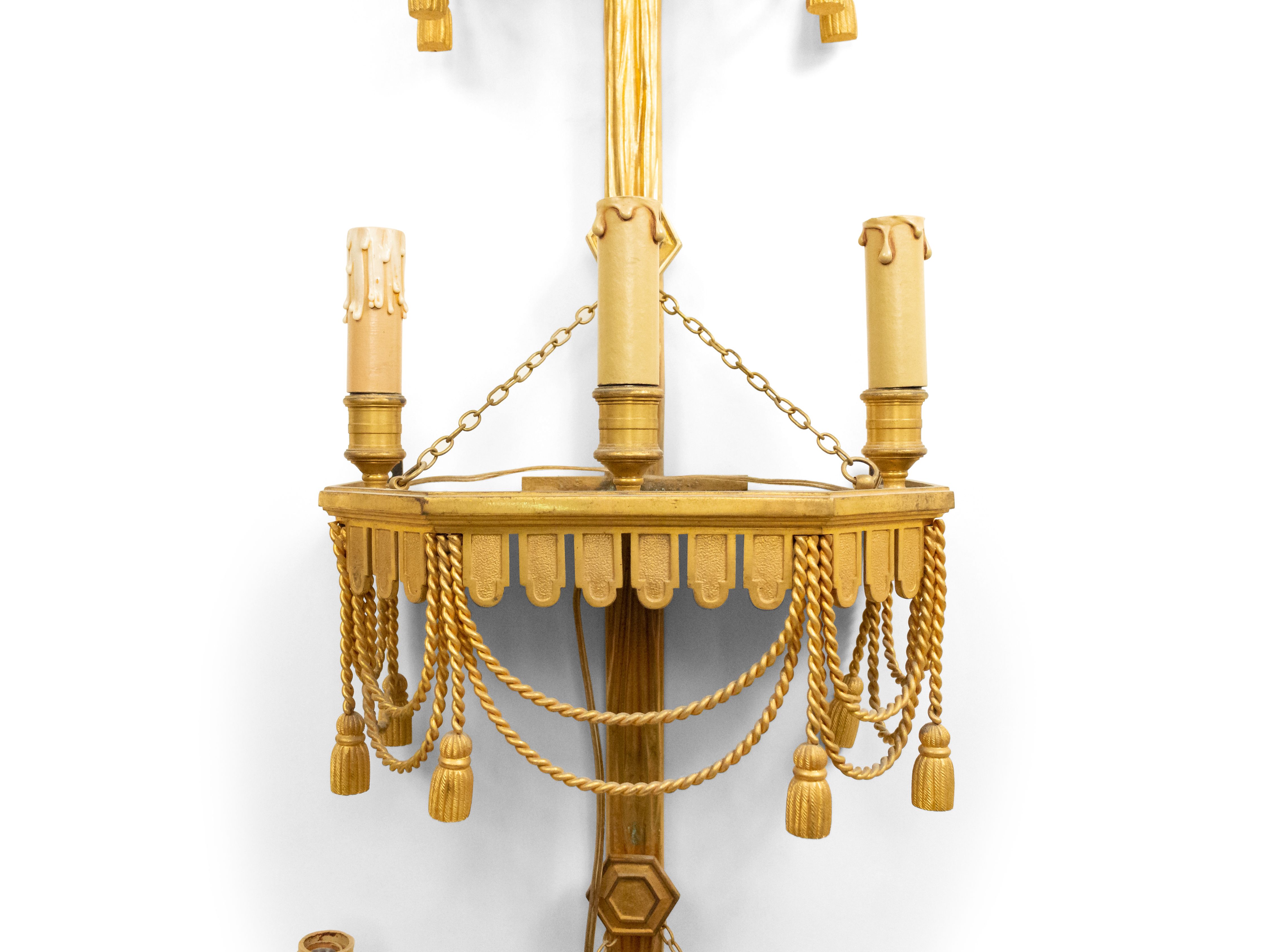 PAIR of French Victorian-style (19/20th Century) bronze dore three-tier wall sconces with nine lights and a rope and tassel design. (PRICED AS PAIR)