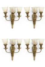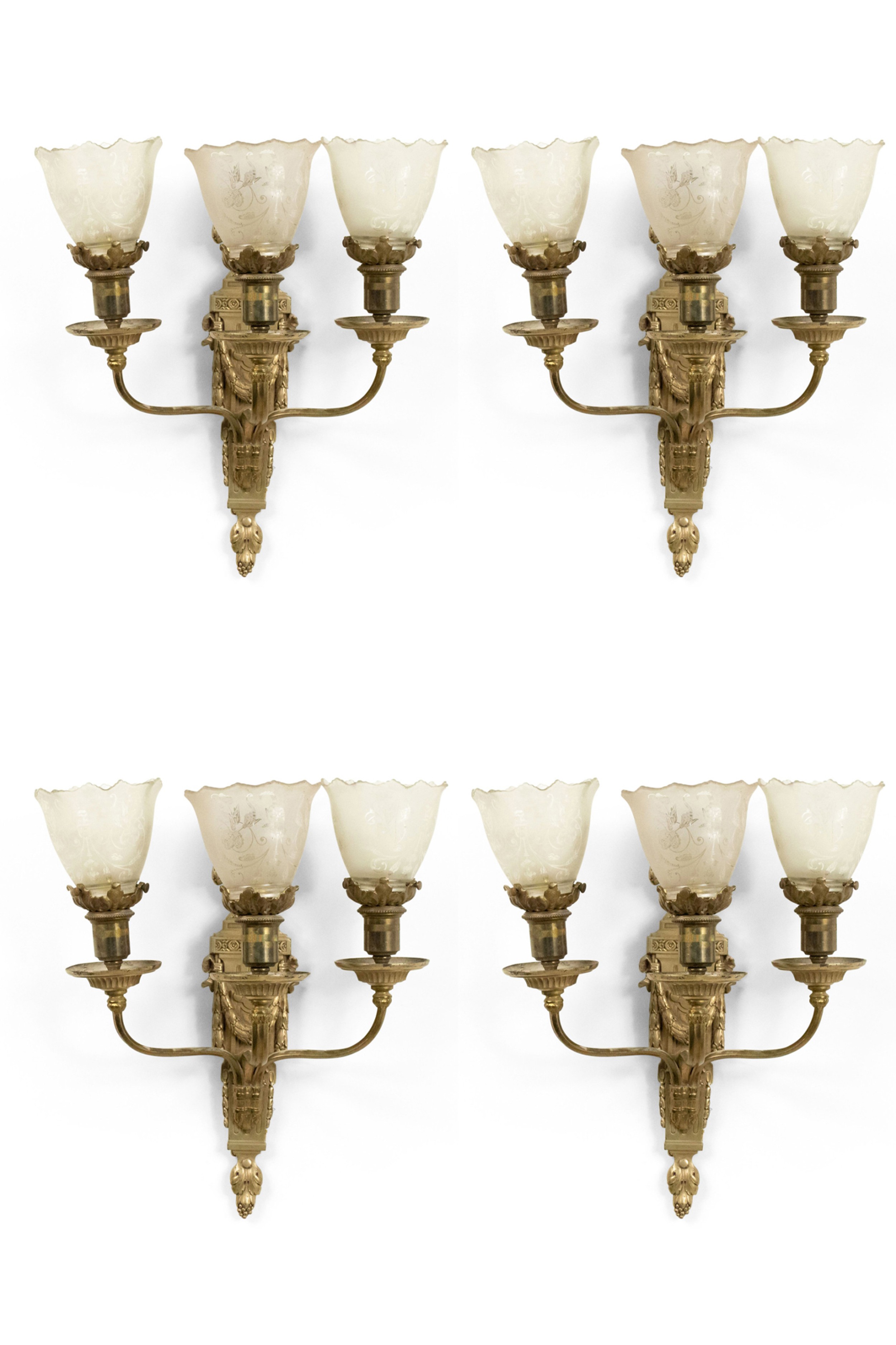 4 French Victorian style (19/20th Century) bronze wall sconces with three arms, swag design, and oval bow knot tops with etched crystal shades (PRICED EACH).