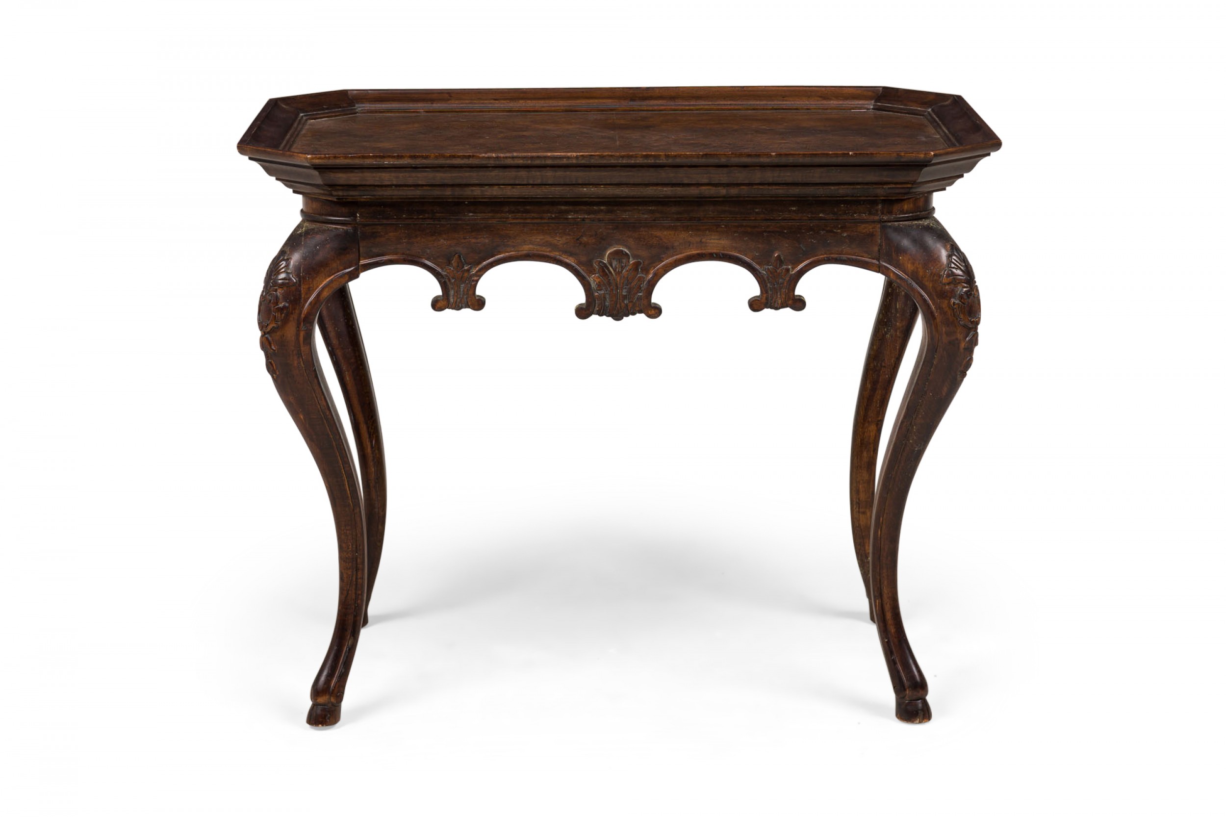 French Victorian-Style rectangular console / occasional table with an angled shallow beveled gallery around a marble veneer table top with canted corners, with carved apron and embellishments at the top curvature of the four cabriole legs..