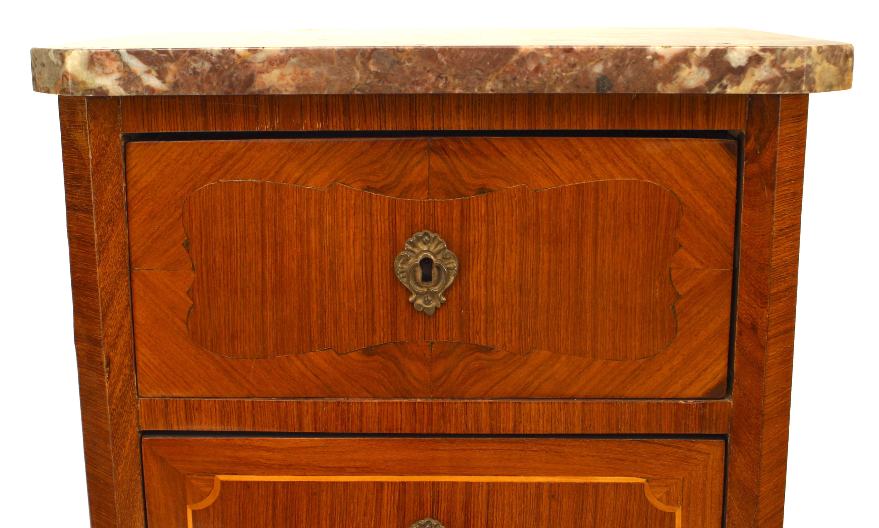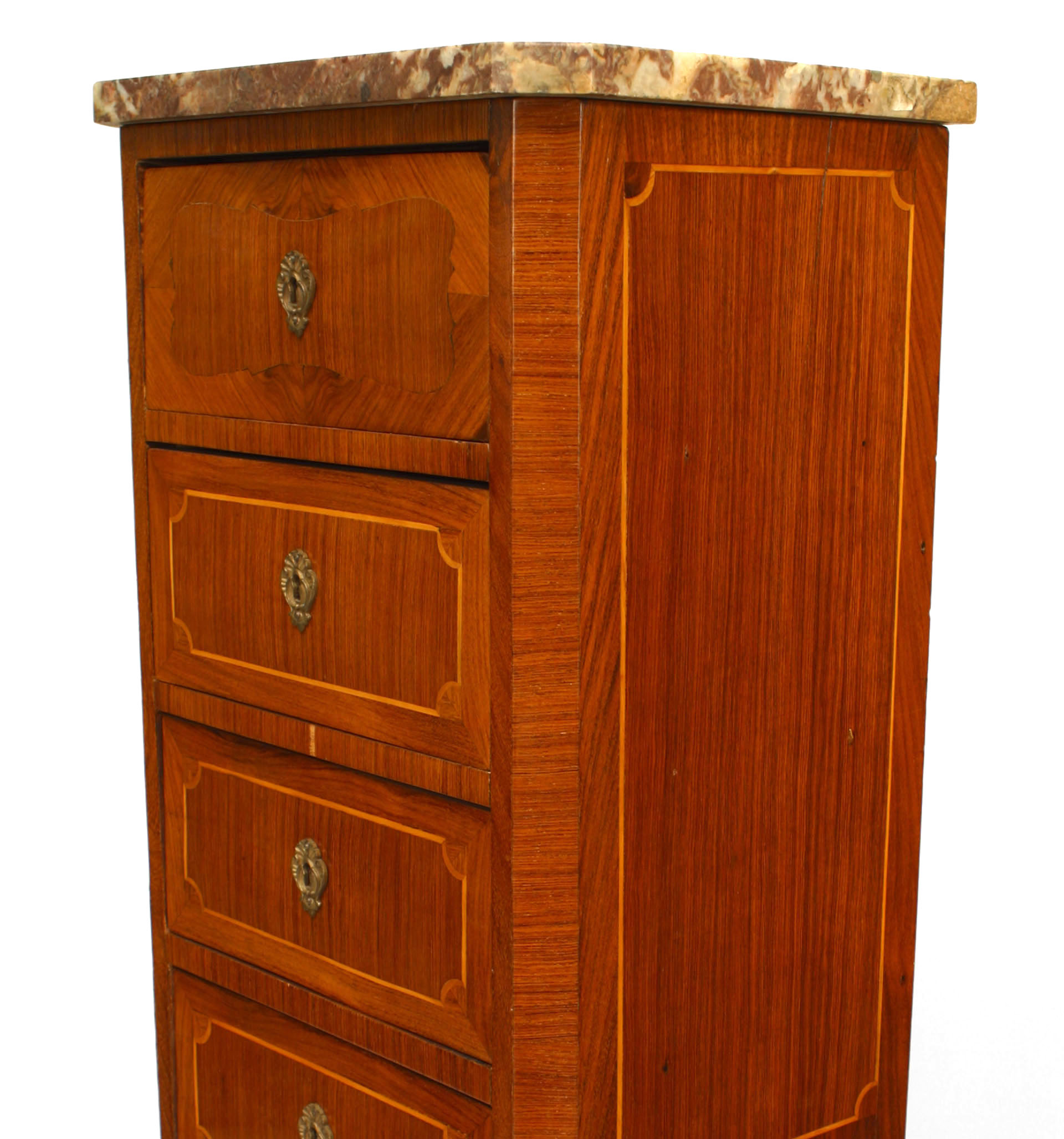 French Victorian narrow walnut and inlaid semanier, 7 drawer chest with a marble top..