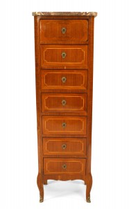 French Victorian narrow walnut and inlaid semanier, 7 drawer chest with a marble top.