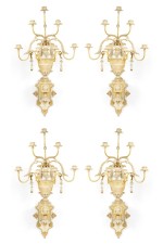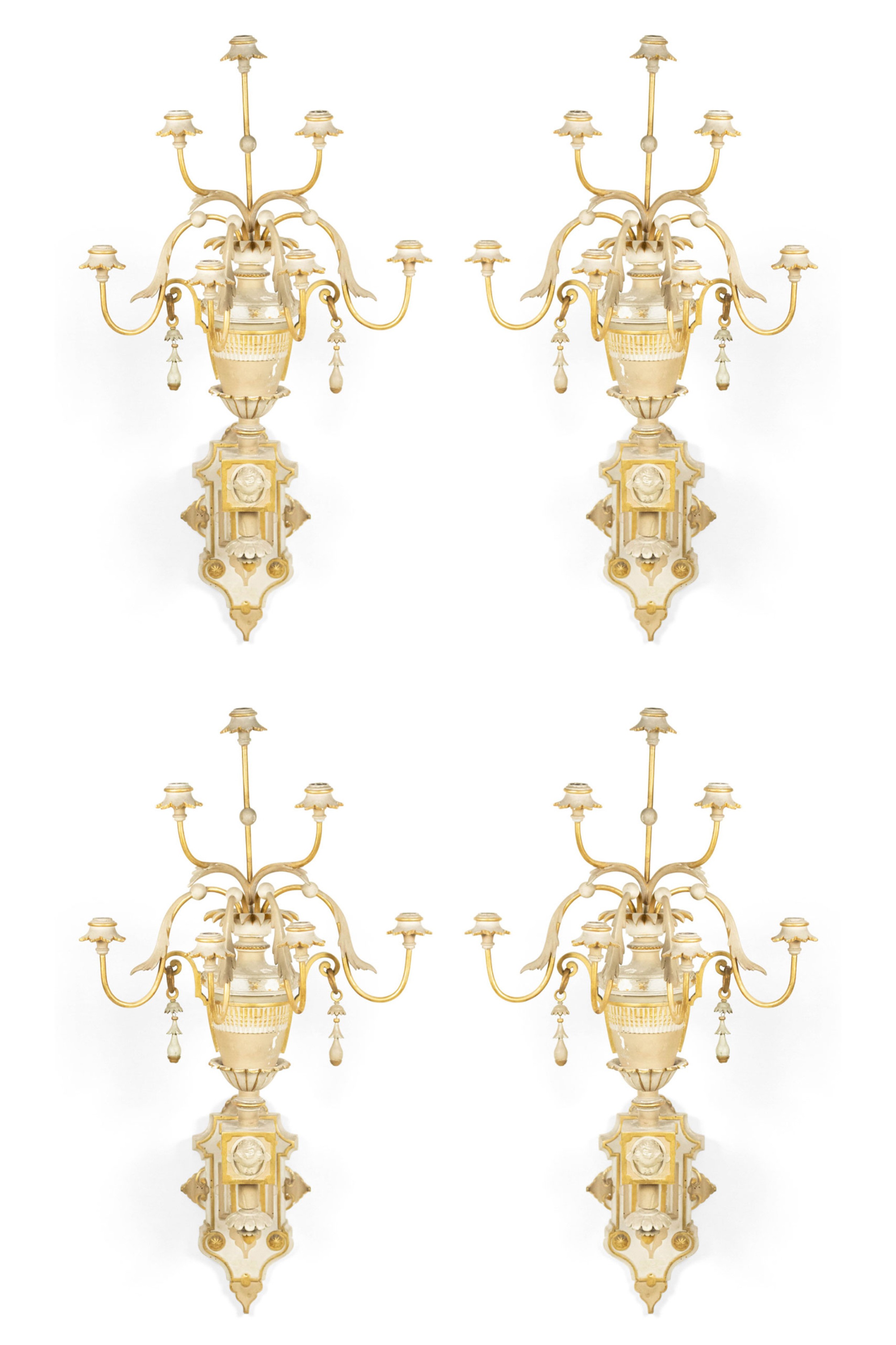 4 French Victorian white painted and gilt trimmed carved wood wall sconces with seven arms, urn design, and cupid head detail. (PRICED EACH).
