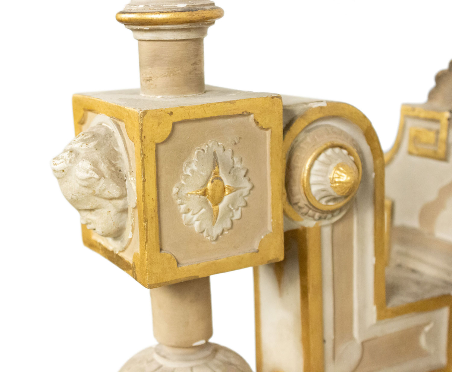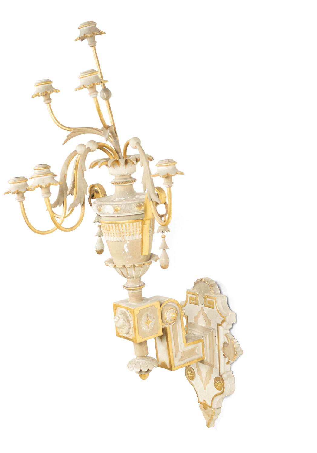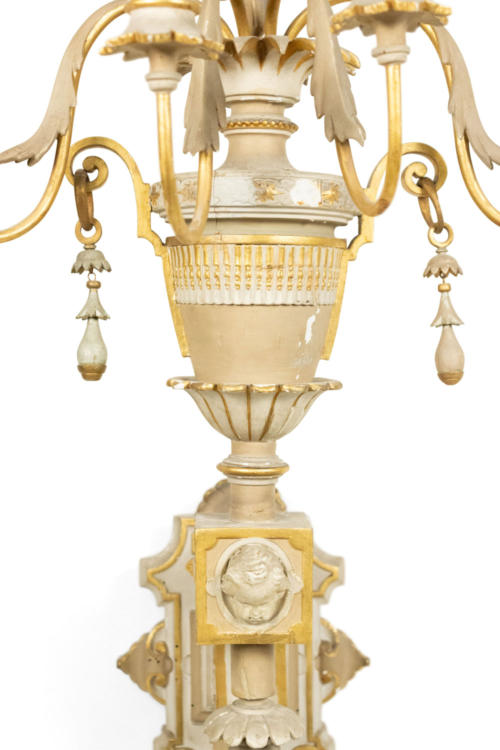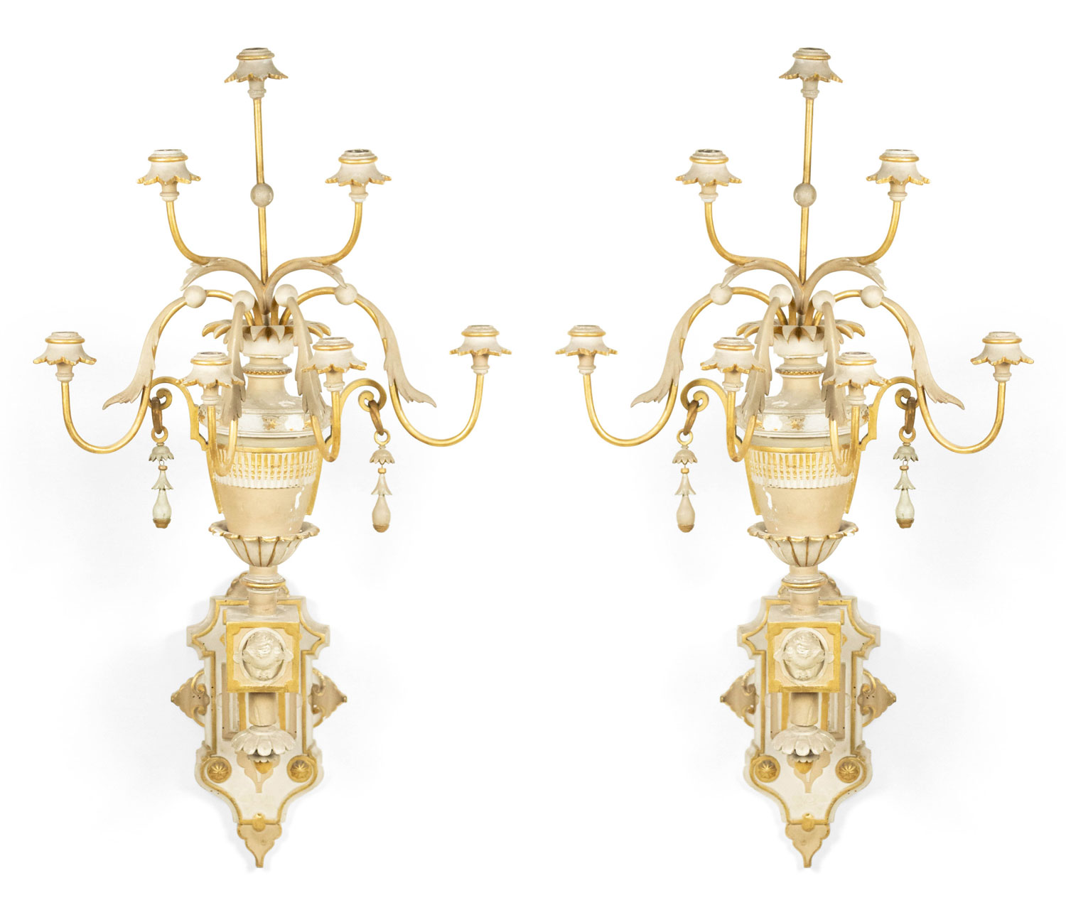 4 French Victorian white painted and gilt trimmed carved wood wall sconces with seven arms, urn design, and cupid head detail. (PRICED EACH)