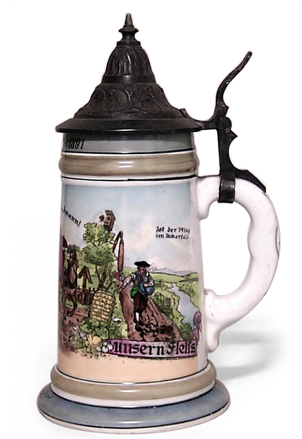 German (20th Century) porcelain beer stein with farm scene and pewter cover with finial top (with 1891 on base)
