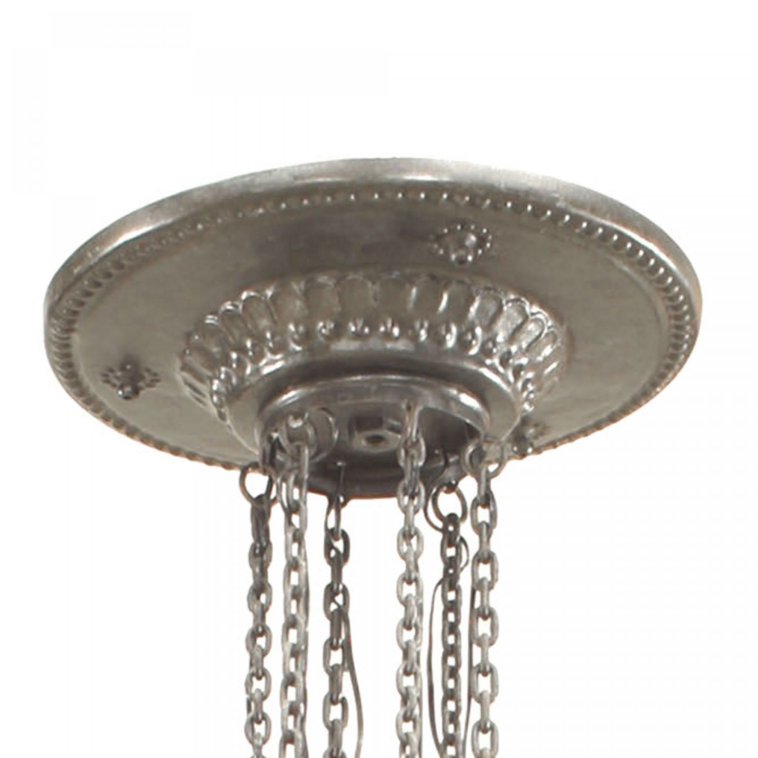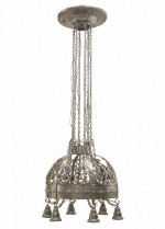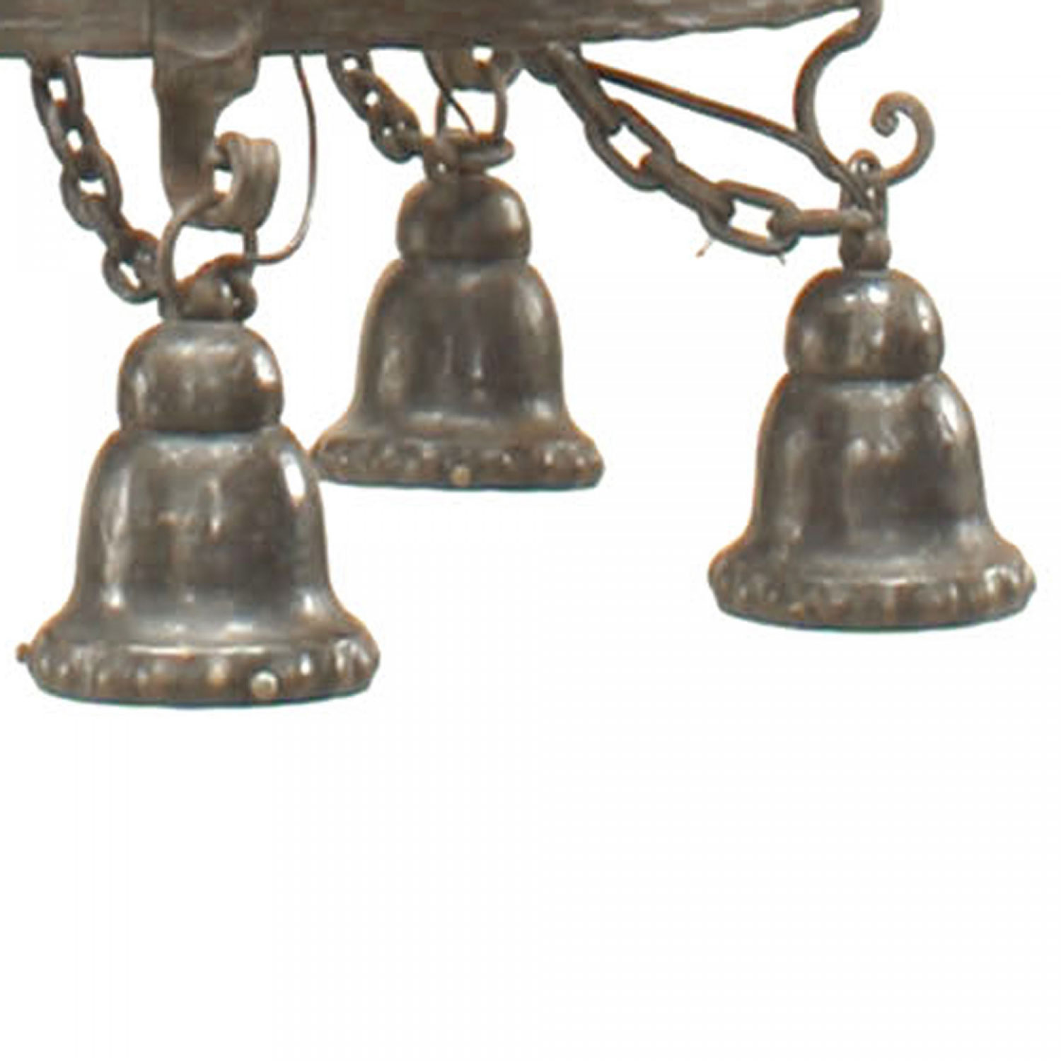 German (1920's) wrought iron large dome shaped 6 light chandelier with filigree scroll design suspended by 6 link chains attached to a canopy.