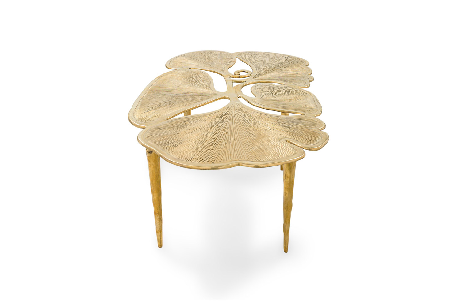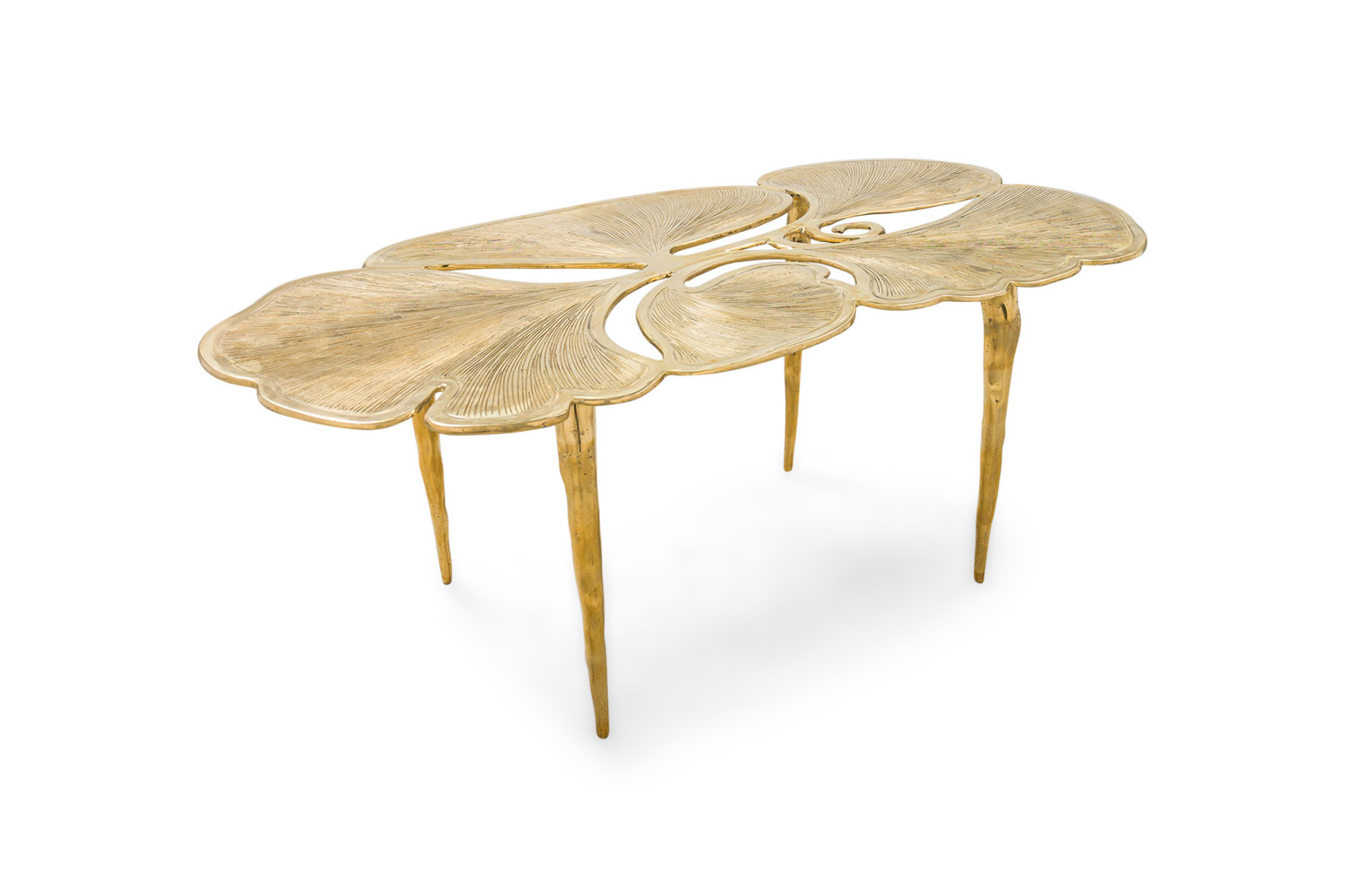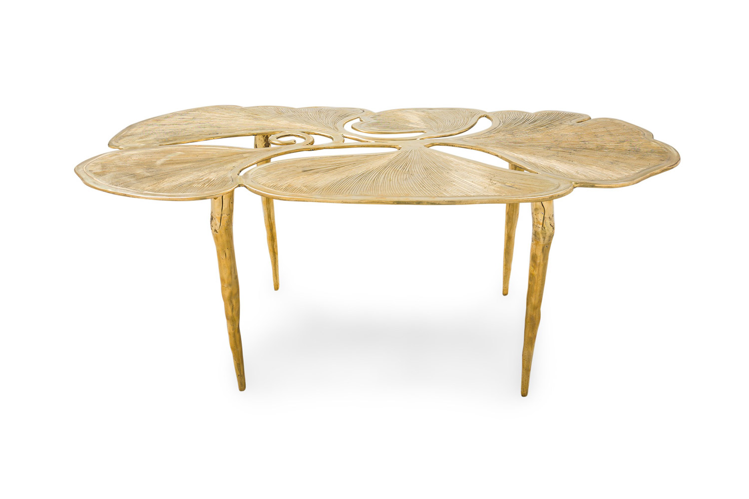 "Gingko" Biomorphic coffee table featuring an intricately carved leaf-inspired tabletop and base constructed of polished hand-forged bronze.