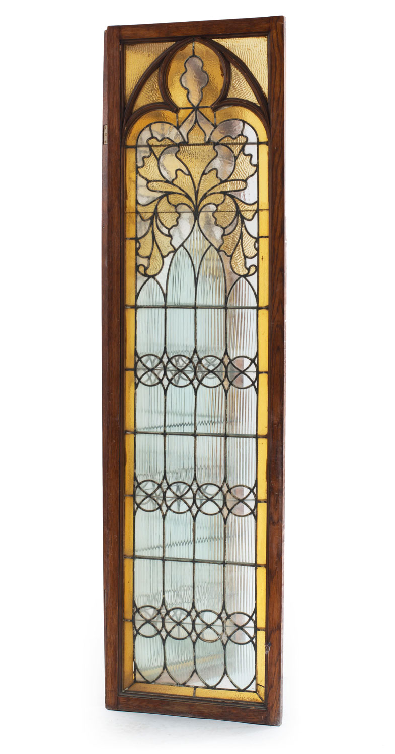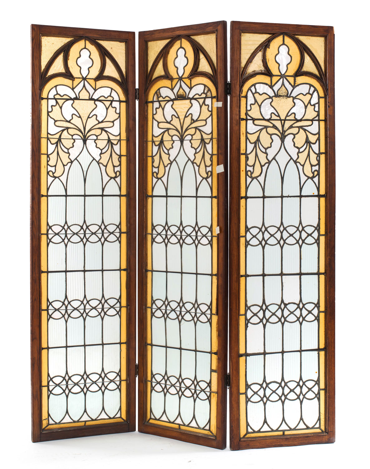 English Gothic Revival style (19th Century) oak framed 3 fold screen with amber colored and clear leaded glass panels..