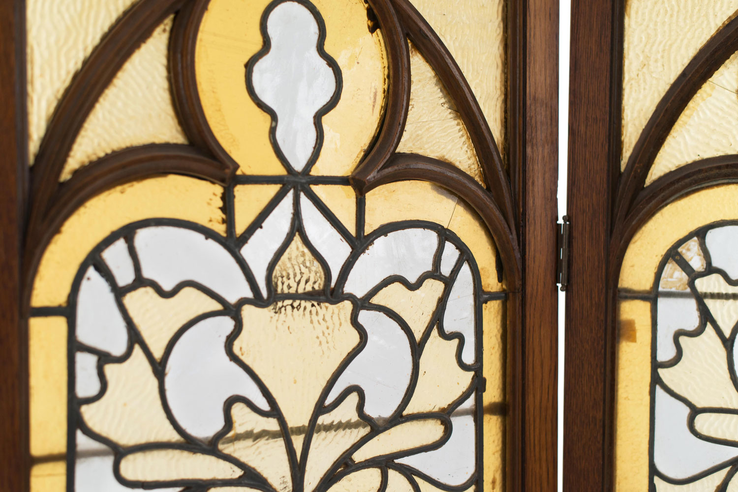 Gothic Revival Oak 3-Fold Screen with Stain Glass Panels