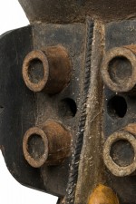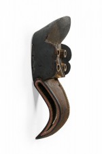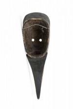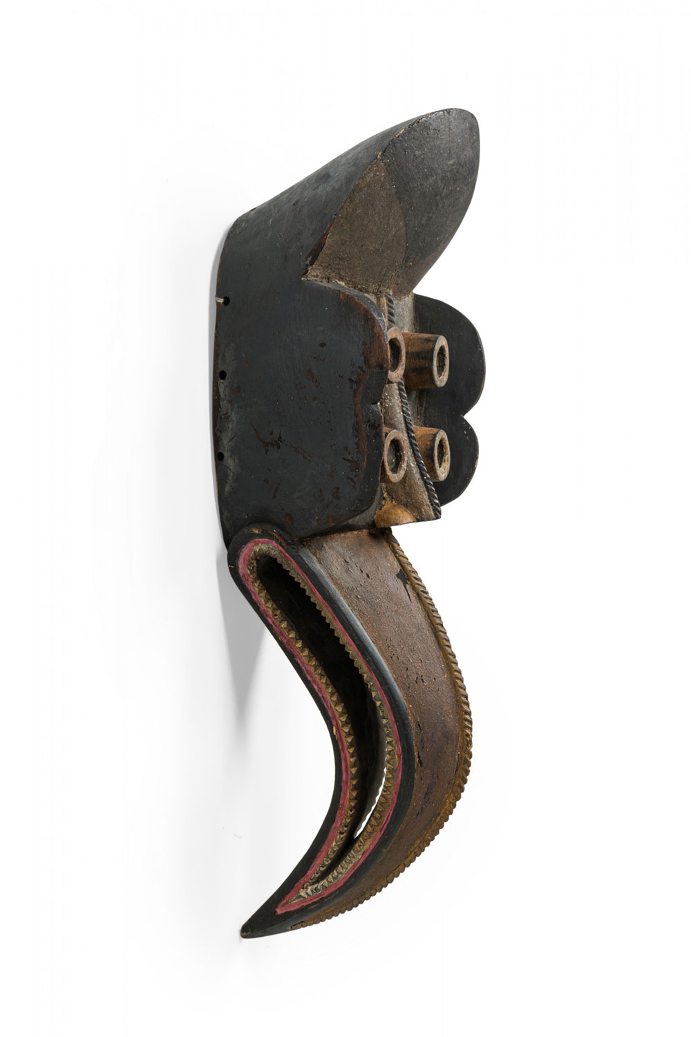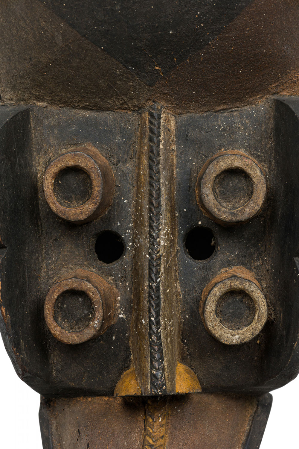 Asican style Carved and painted wood mask wall plaque in bird form with 2 pairs of cylindrical eyes and an openwork sloped, jagged toothed beak.