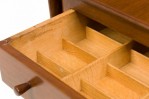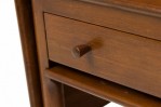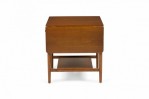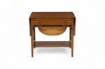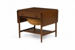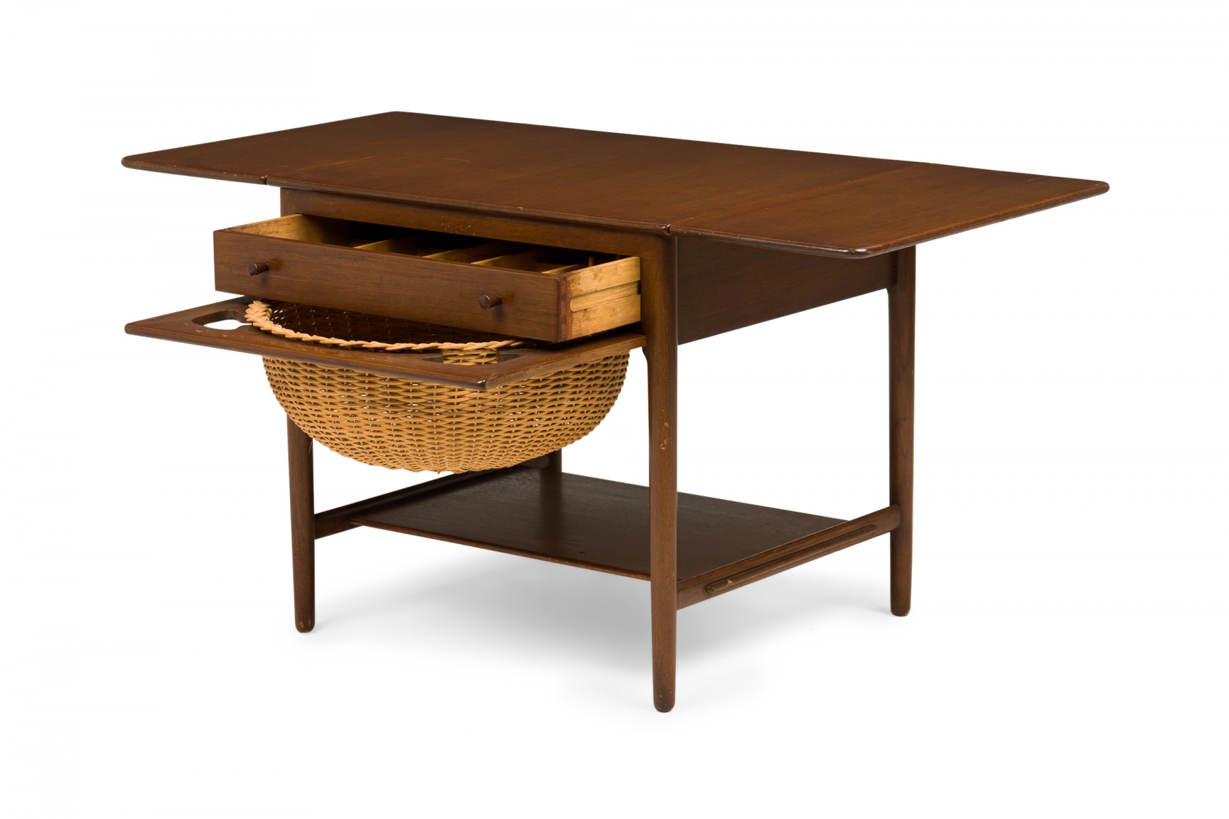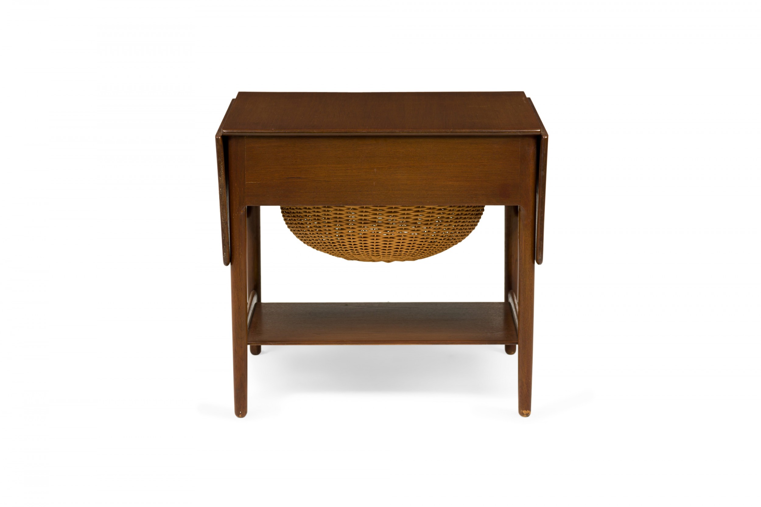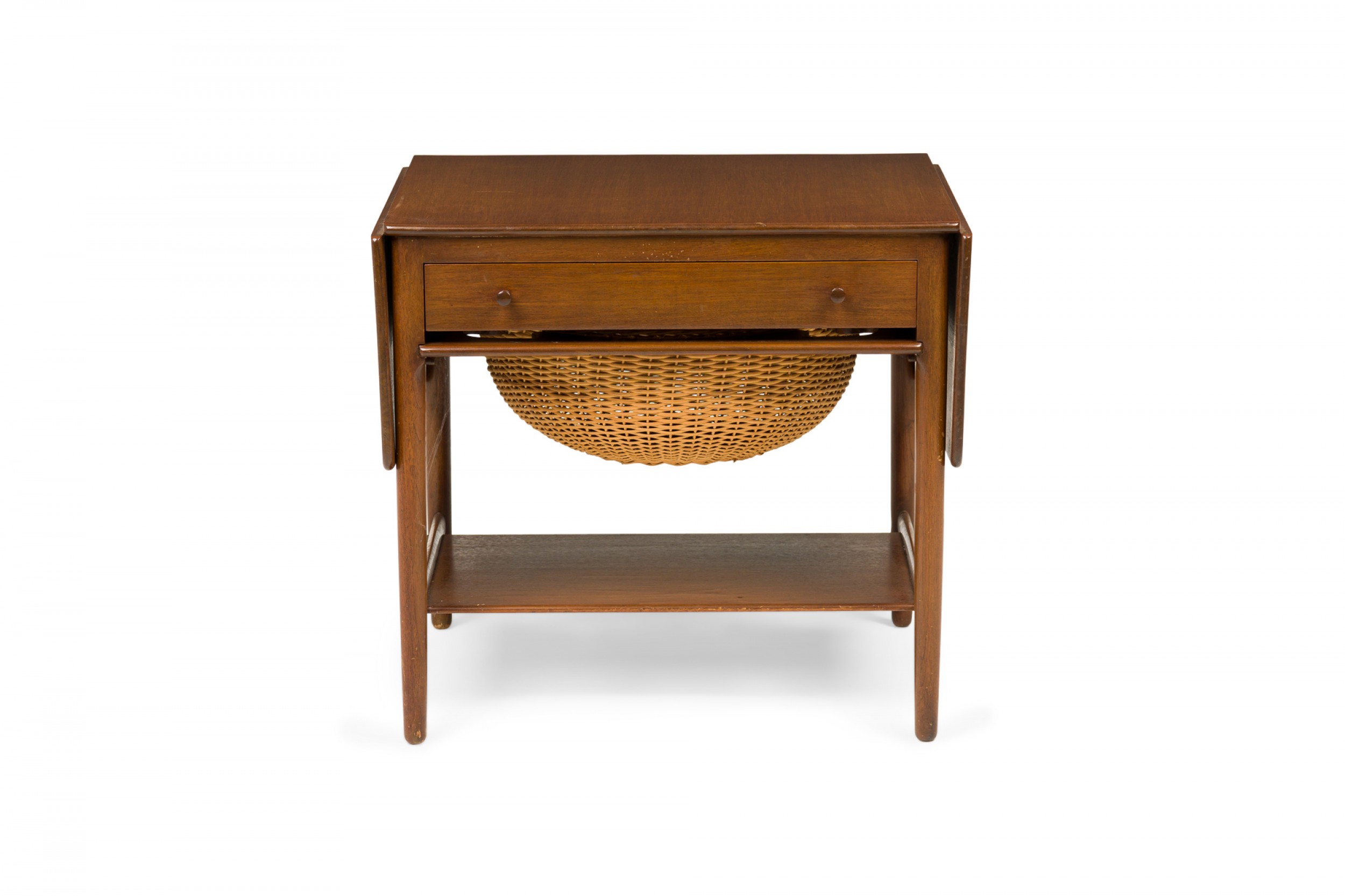 American Mid-Century teak wood sewing table with two drop leaves on either side, a single drawer with two wooden knob drawer pulls, and a sliding compartment containing a removable woven wicker basket over a smaller stretcher shelf connecting four tapered dowel legs. (HANS WEGNER FOR ANDREAS TUCK)