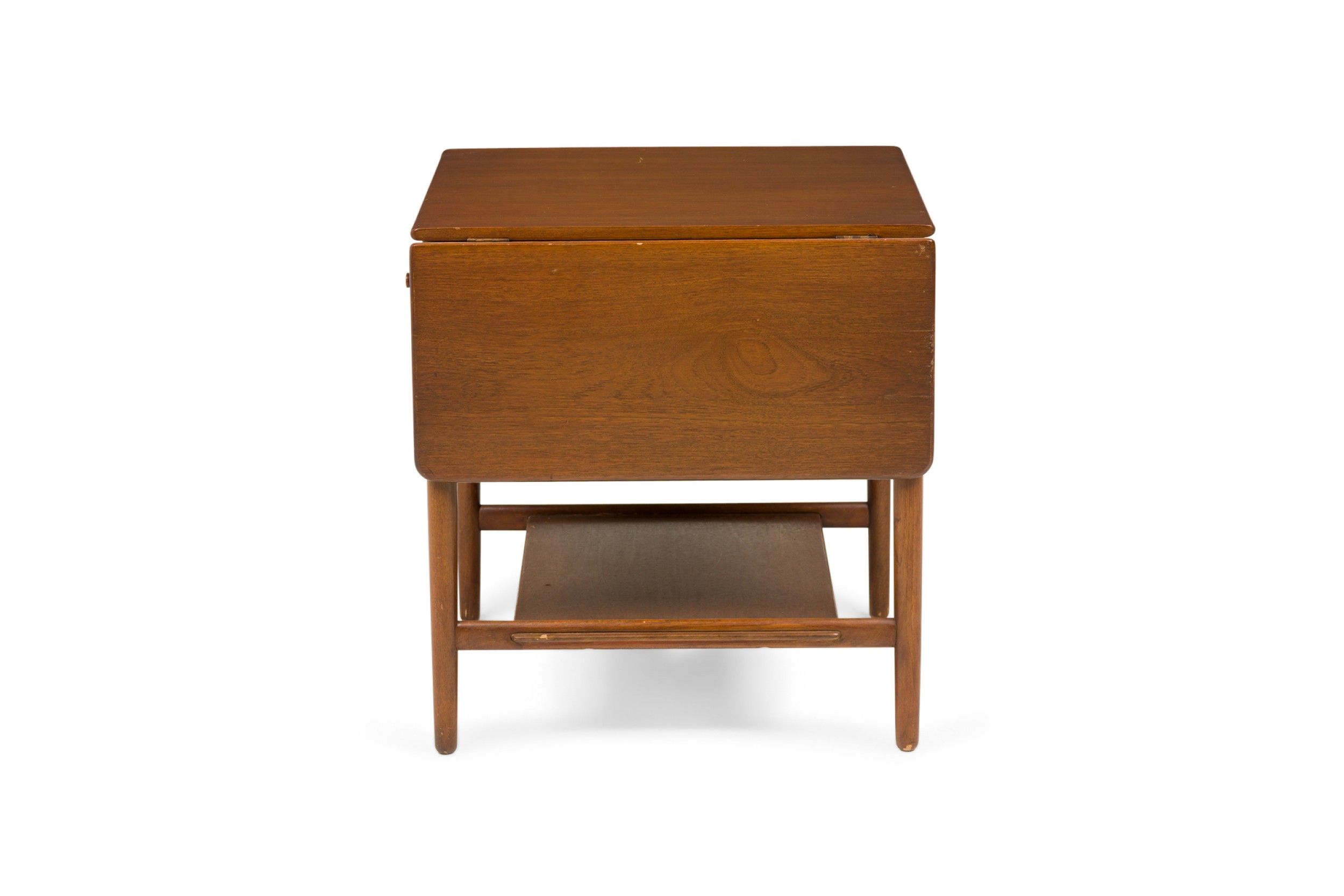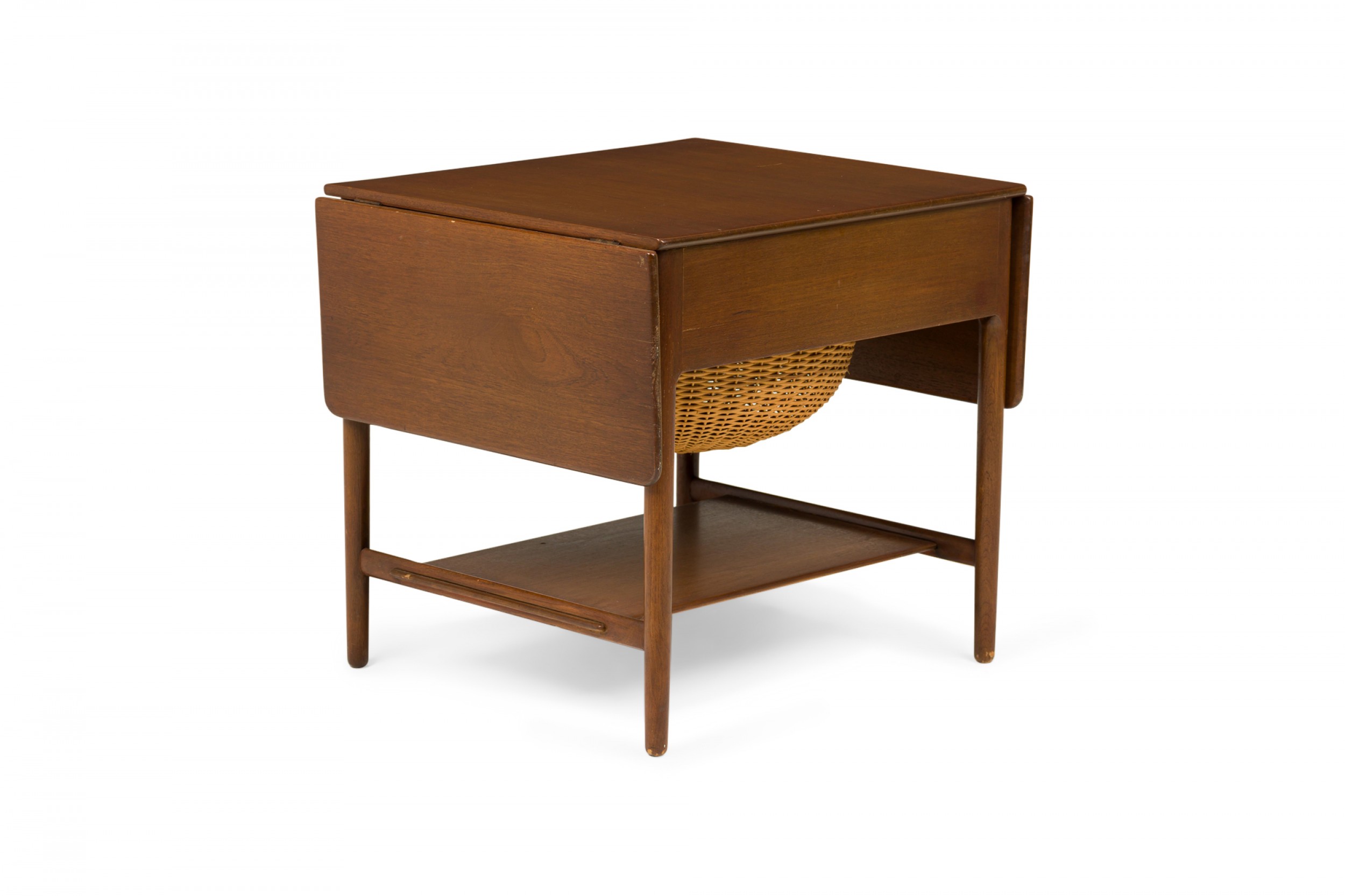 American Mid-Century teak wood sewing table with two drop leaves on either side, a single drawer with two wooden knob drawer pulls, and a sliding compartment containing a removable woven wicker basket over a smaller stretcher shelf connecting four tapered dowel legs. (HANS WEGNER FOR ANDREAS TUCK).