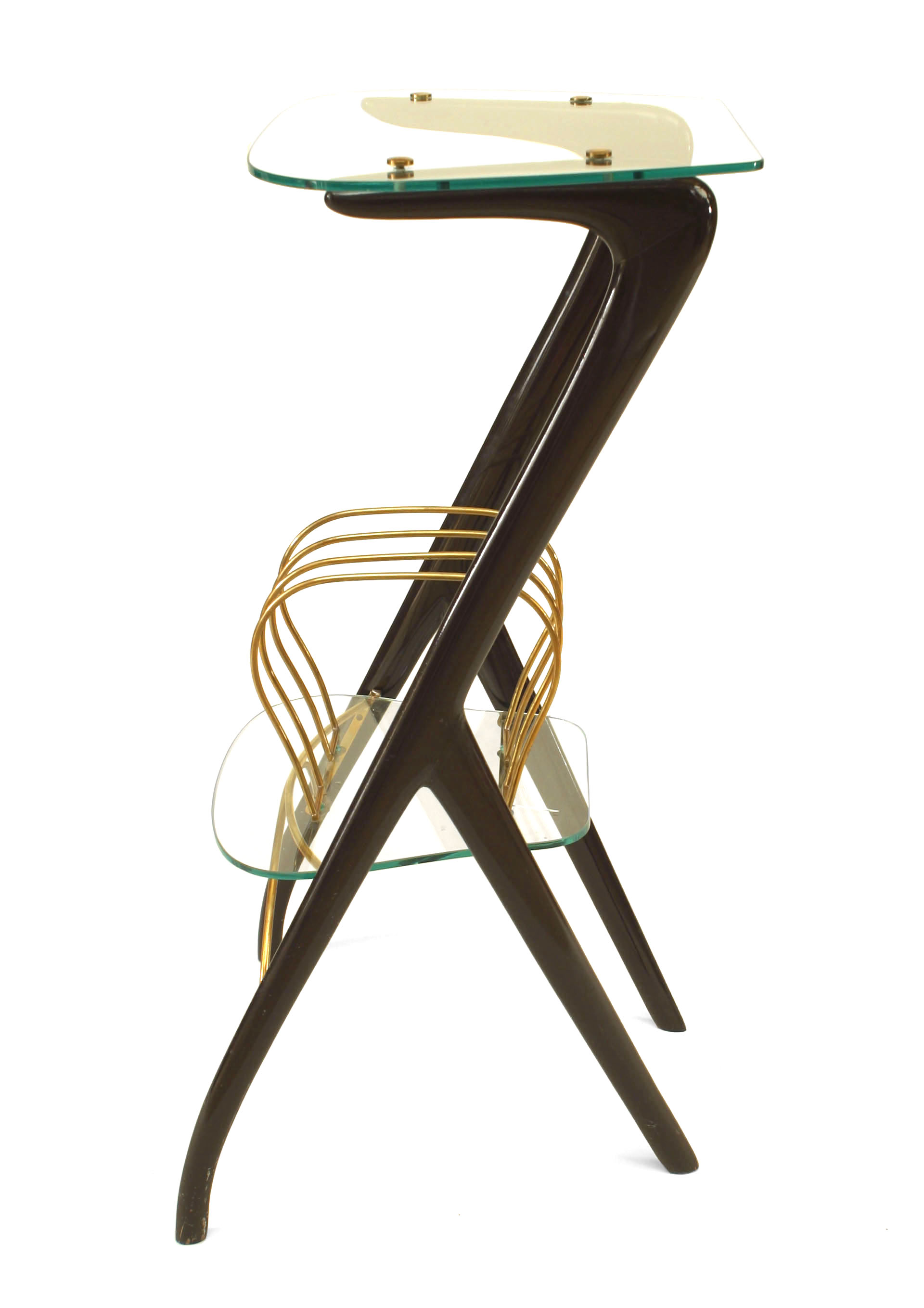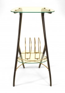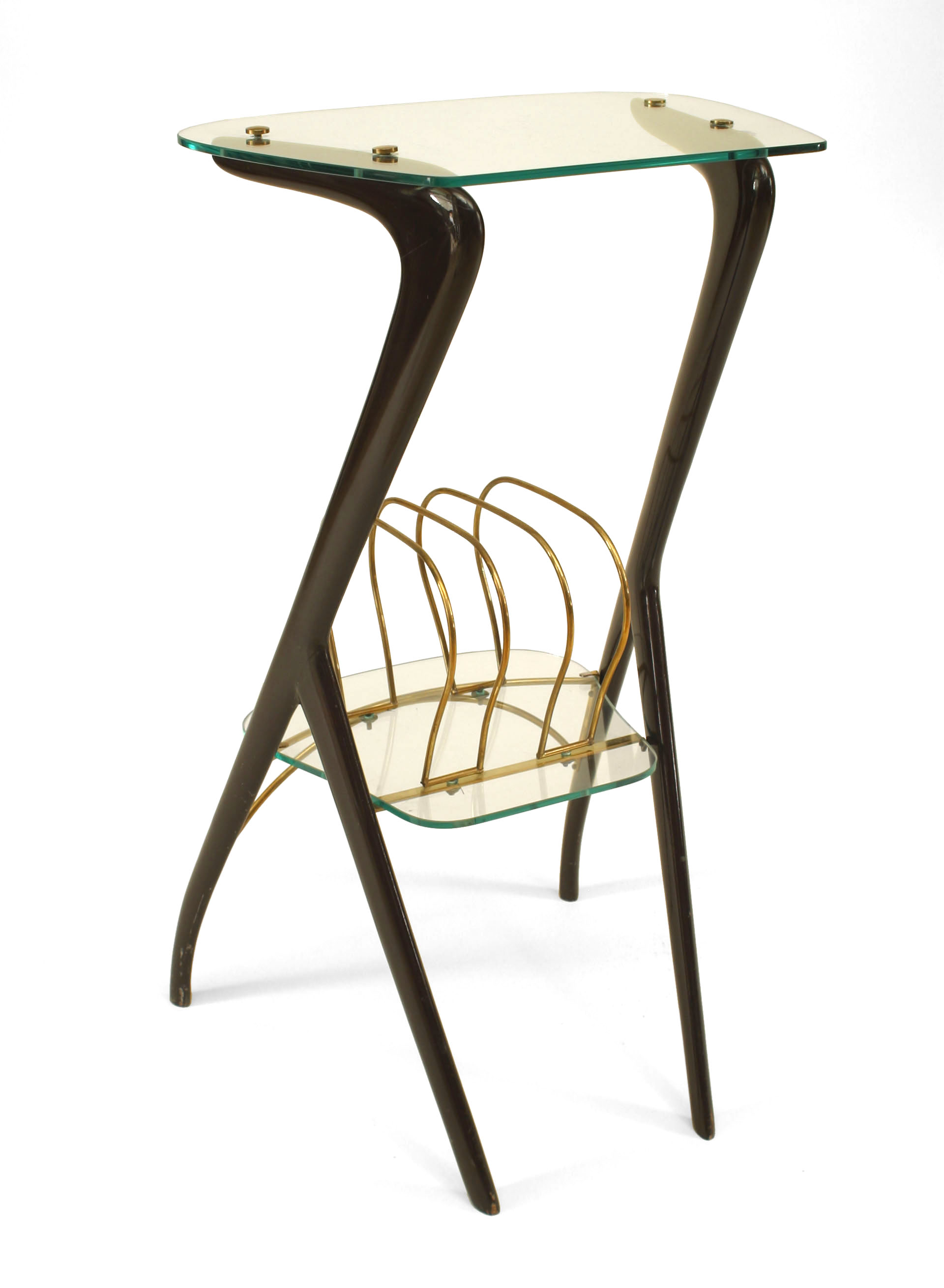 Italian Mid-Century (1940s) small end table with ebonized wood sides supporting a glass top and shelf with brass magazine rack. (Attributed to ICO PARISI).