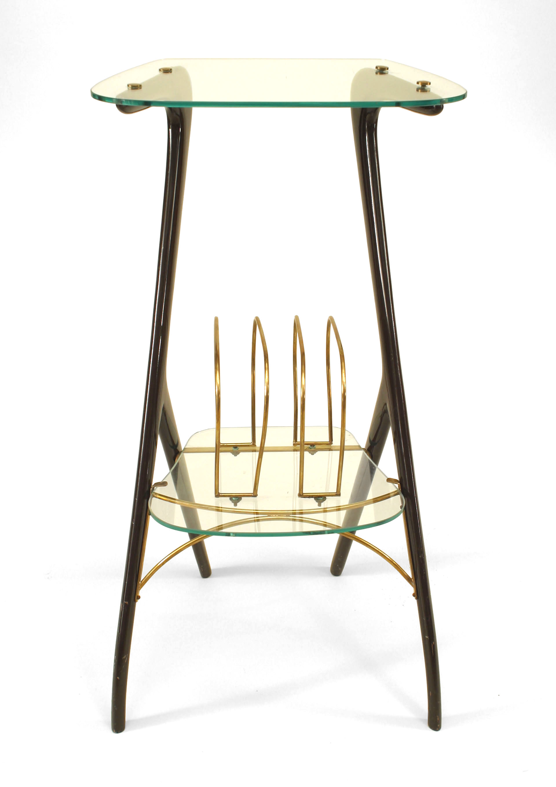 Italian Mid-Century (1940s) small end table with ebonized wood sides supporting a glass top and shelf with brass magazine rack. (Attributed to ICO PARISI)