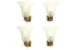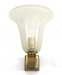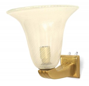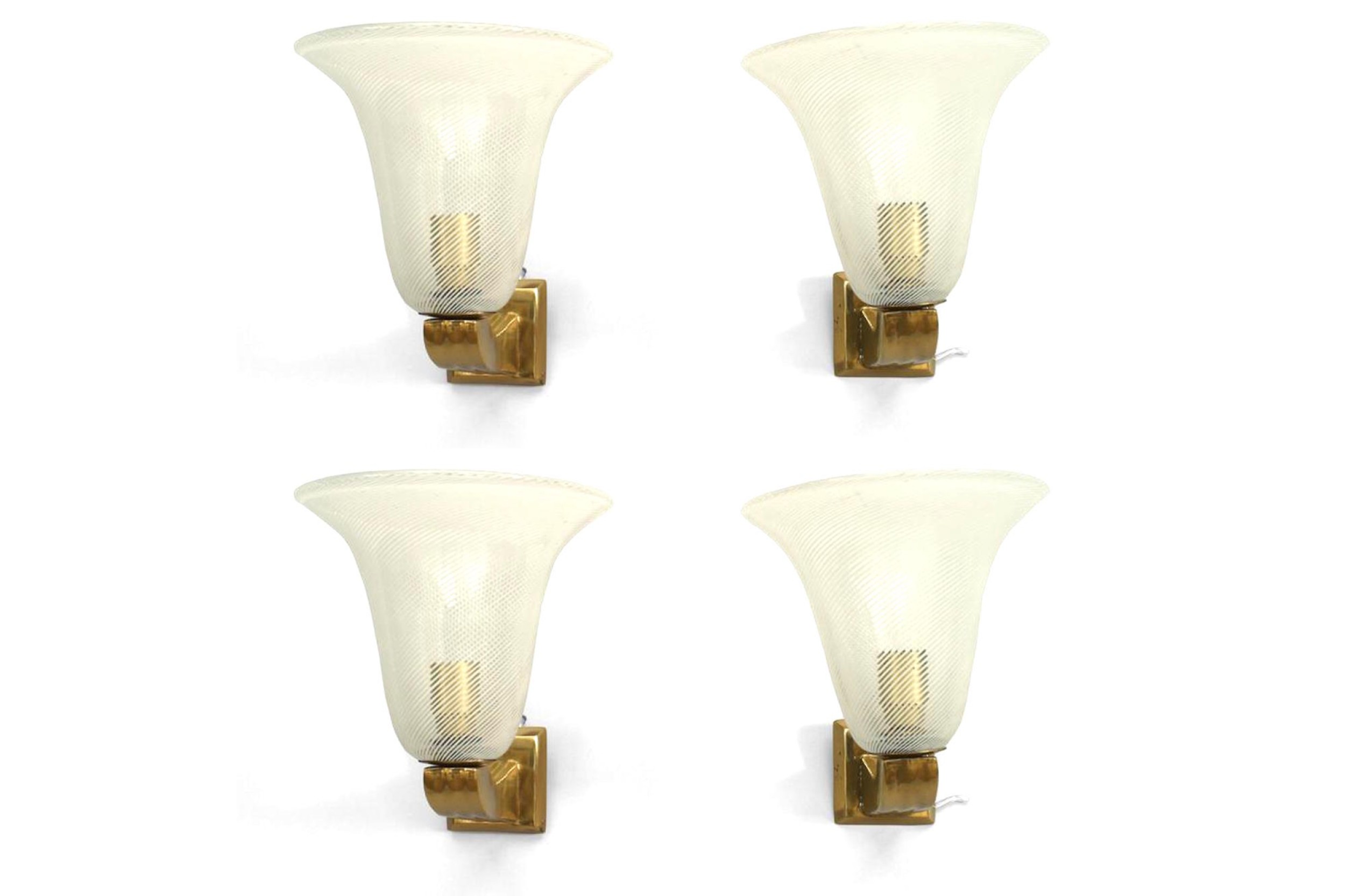 4 Italian Mid-Century (1940's) wall sconces with a clear Murano glass bell shaped shade with a white swirl design supported by a fluted brass bracket (PRICED EACH).