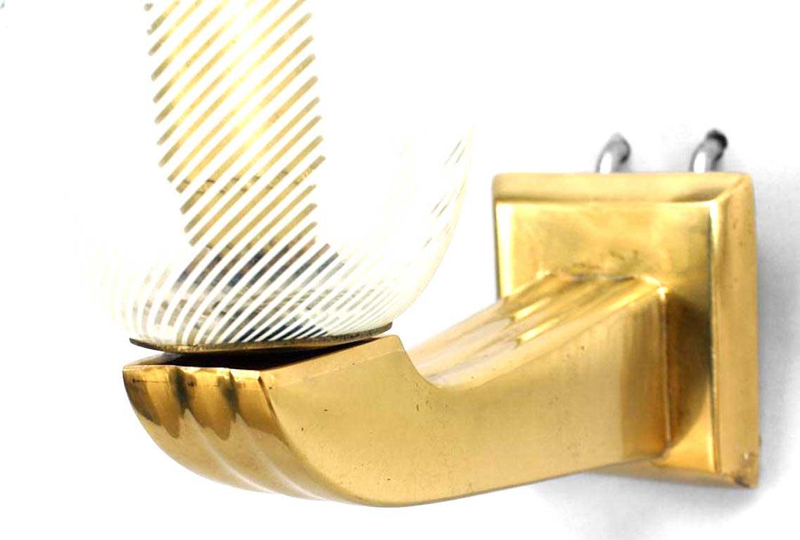 4 Italian Mid-Century (1940's) wall sconces with a clear Murano glass bell shaped shade with a white swirl design supported by a fluted brass bracket (PRICED EACH)