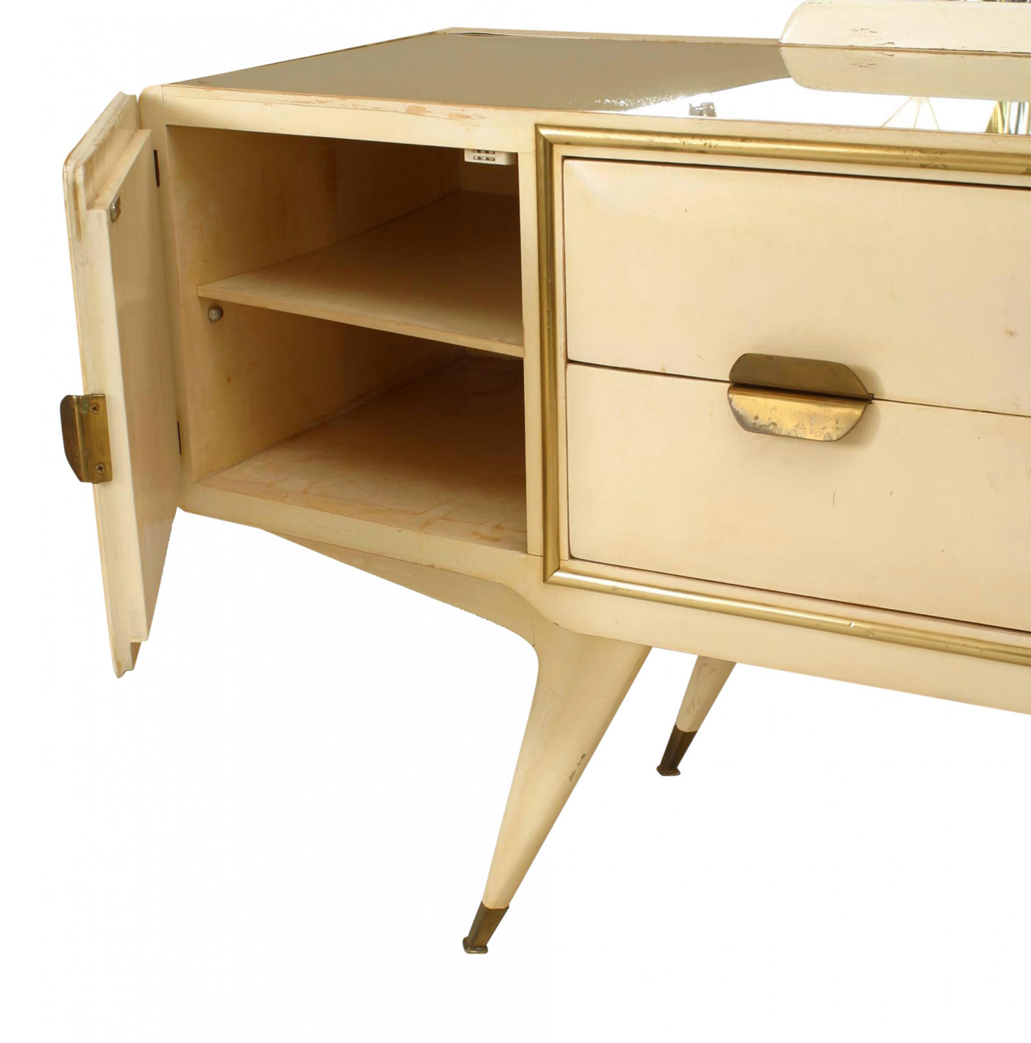 Italian Mid-Century (1950s) white lacquered dresser with 2 doors centering a pair of gilt framed drawers under a gold glass top supporting a large mirror with brass trim and handles (Attributed to GIO PONTI).