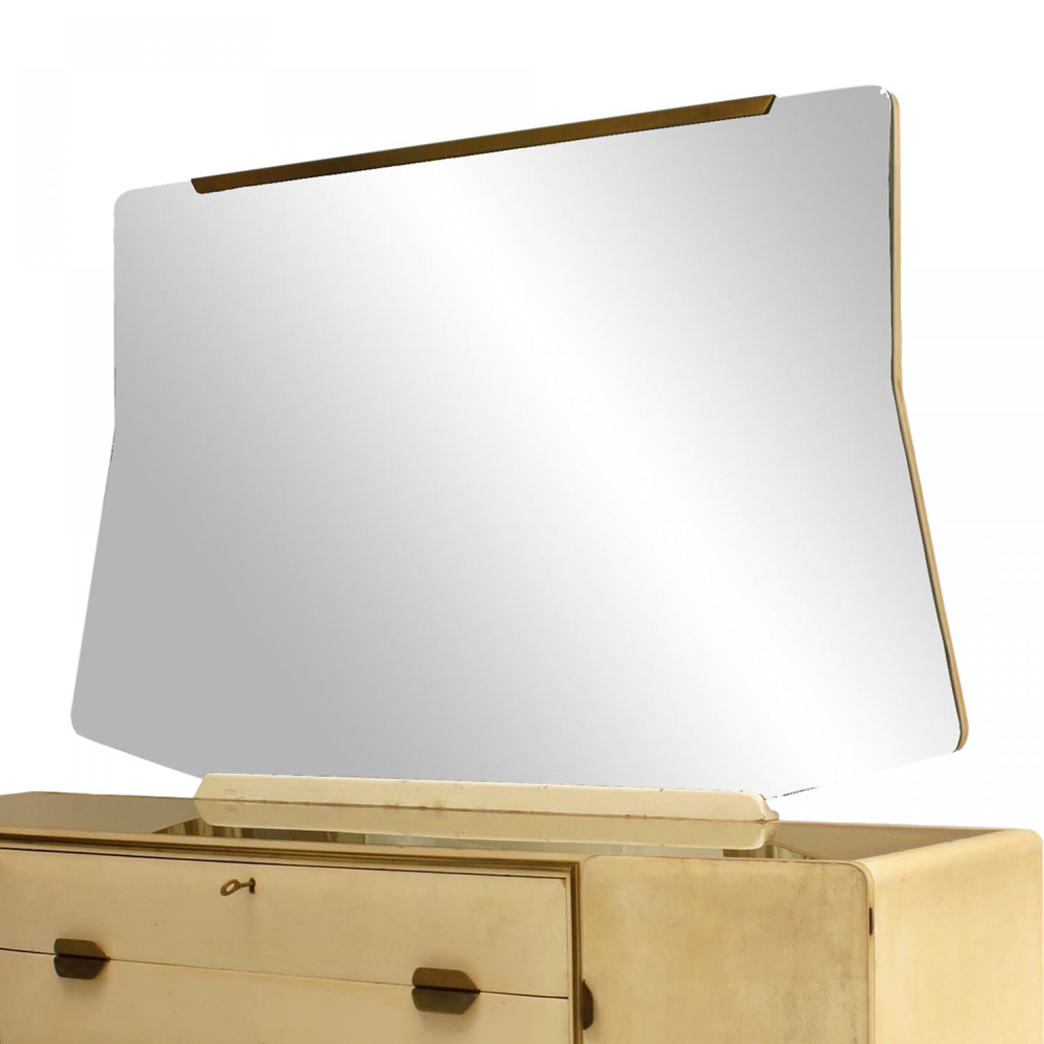 Italian Mid-Century (1950s) white lacquered dresser with 2 doors centering a pair of gilt framed drawers under a gold glass top supporting a large mirror with brass trim and handles (Attributed to GIO PONTI)