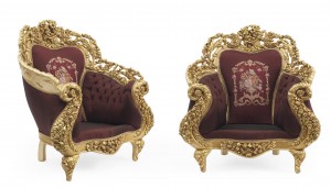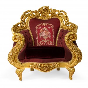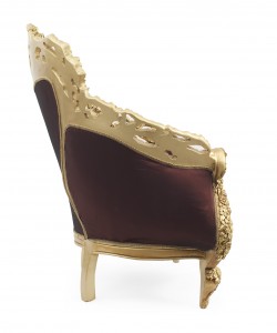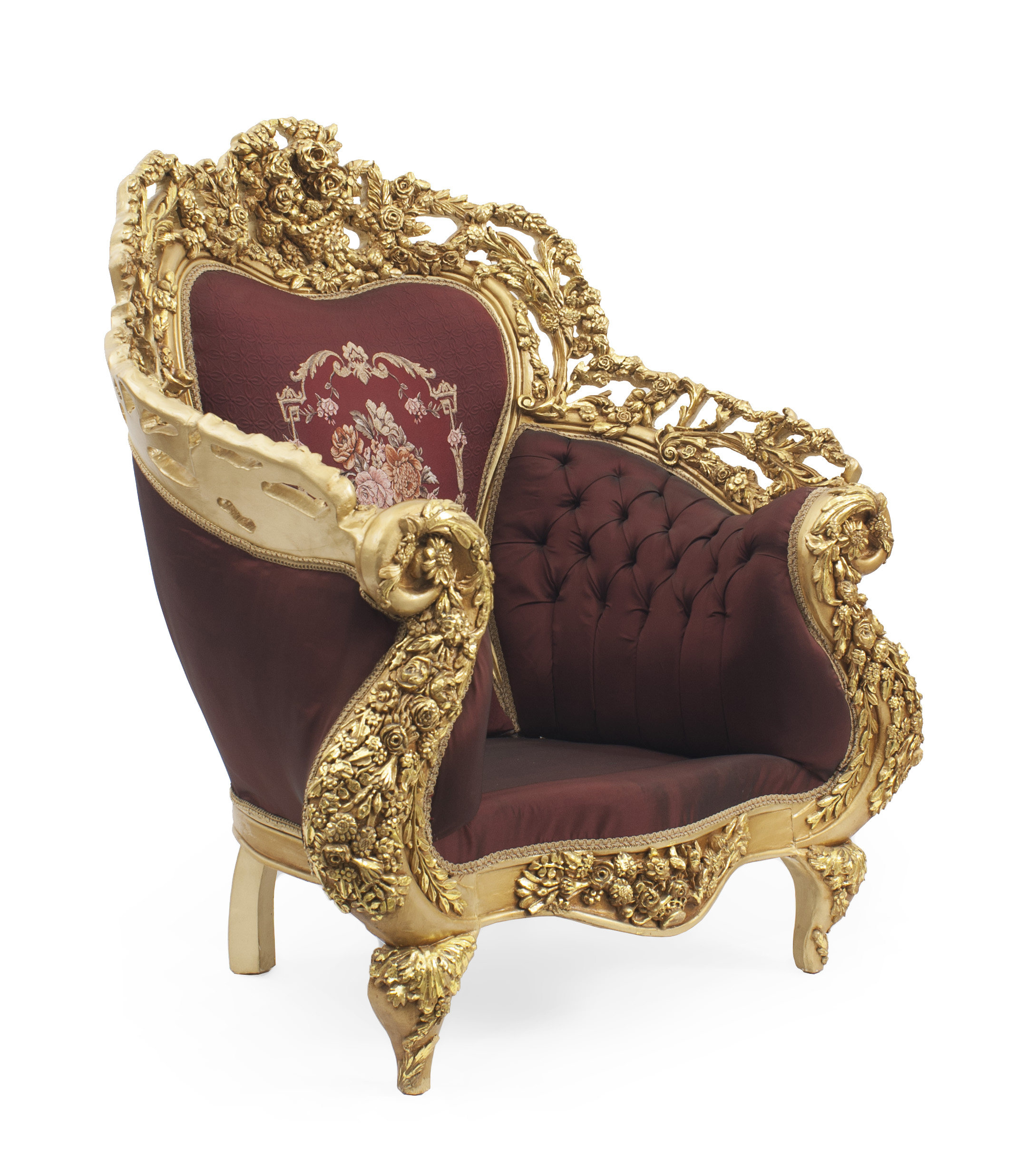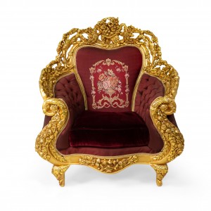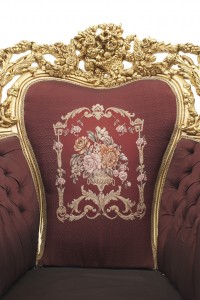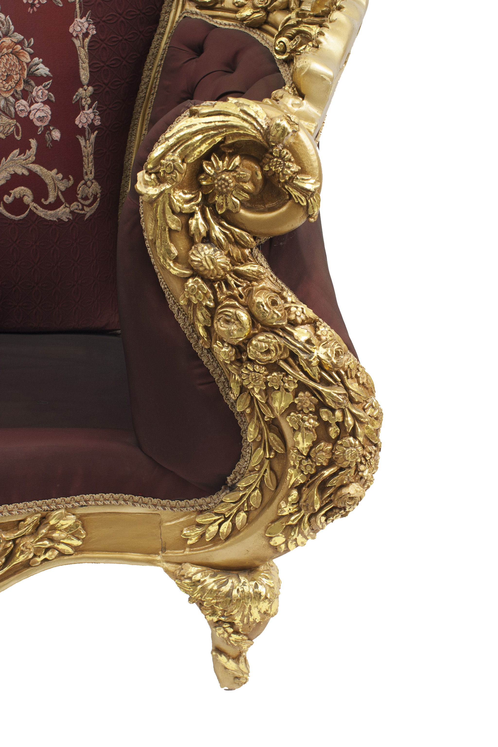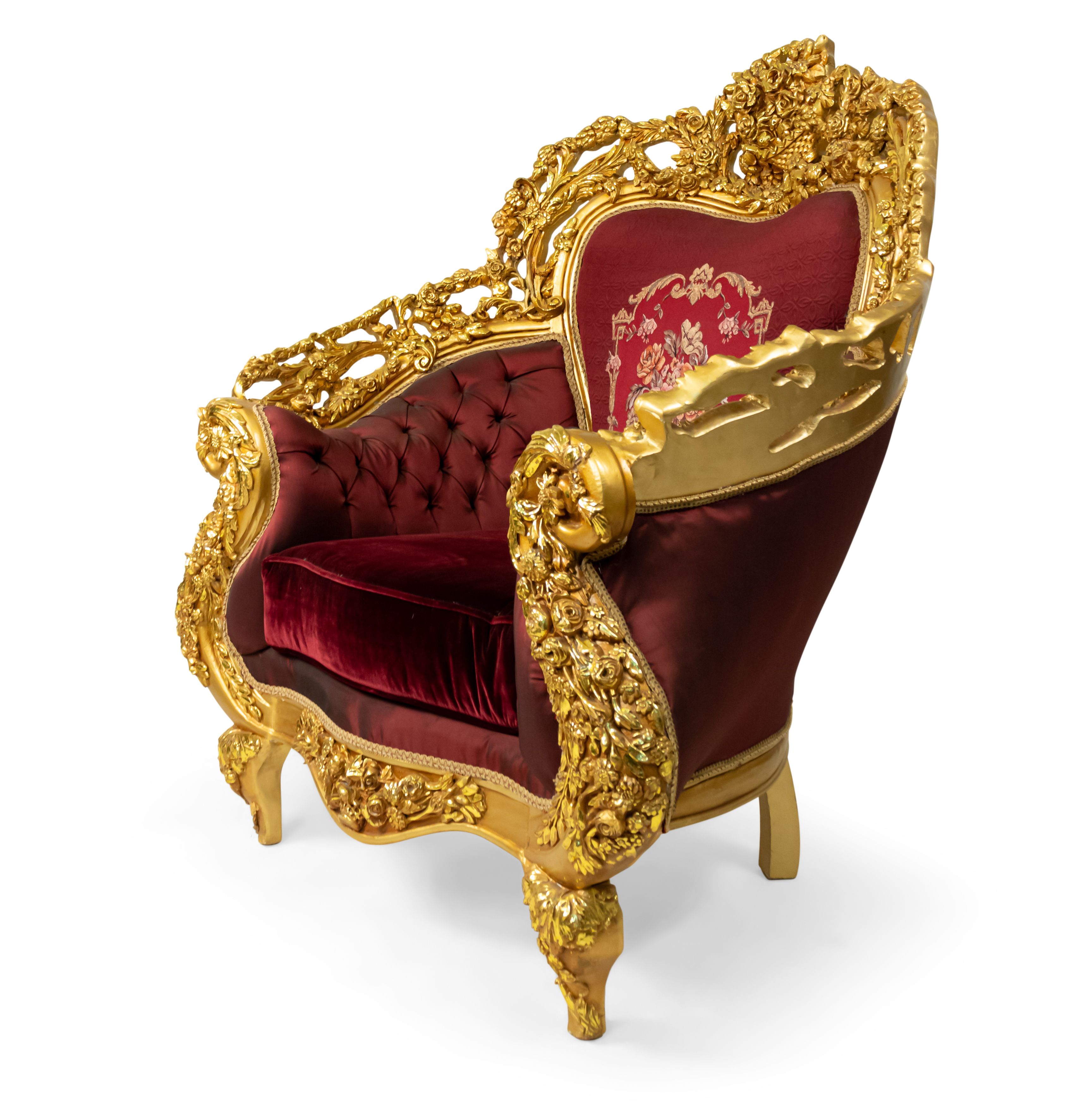 PAIR of Italian Baroque-style (20th Century) armchairs with gilt wood filigree frames and burgundy button-tufted upholstery with embroidered flowers (Related items: AGO054, AGO056, AGO053, Full Set: AGO053A)