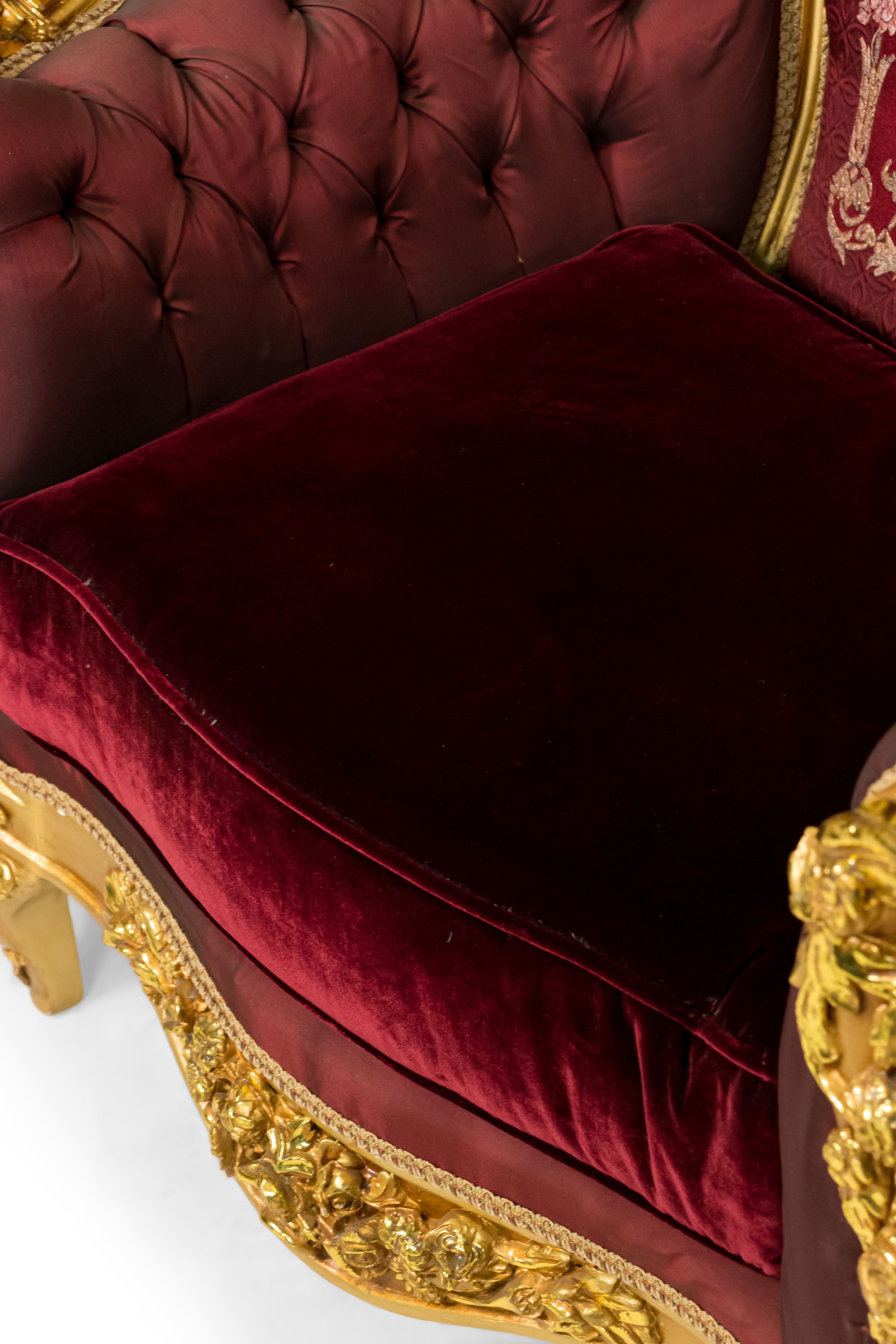 PAIR of Italian Baroque-style (20th Century) armchairs with gilt wood filigree frames and burgundy button-tufted upholstery with embroidered flowers (Related items: AGO054, AGO056, AGO053, Full Set: AGO053A).
