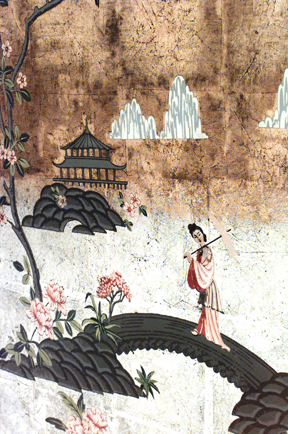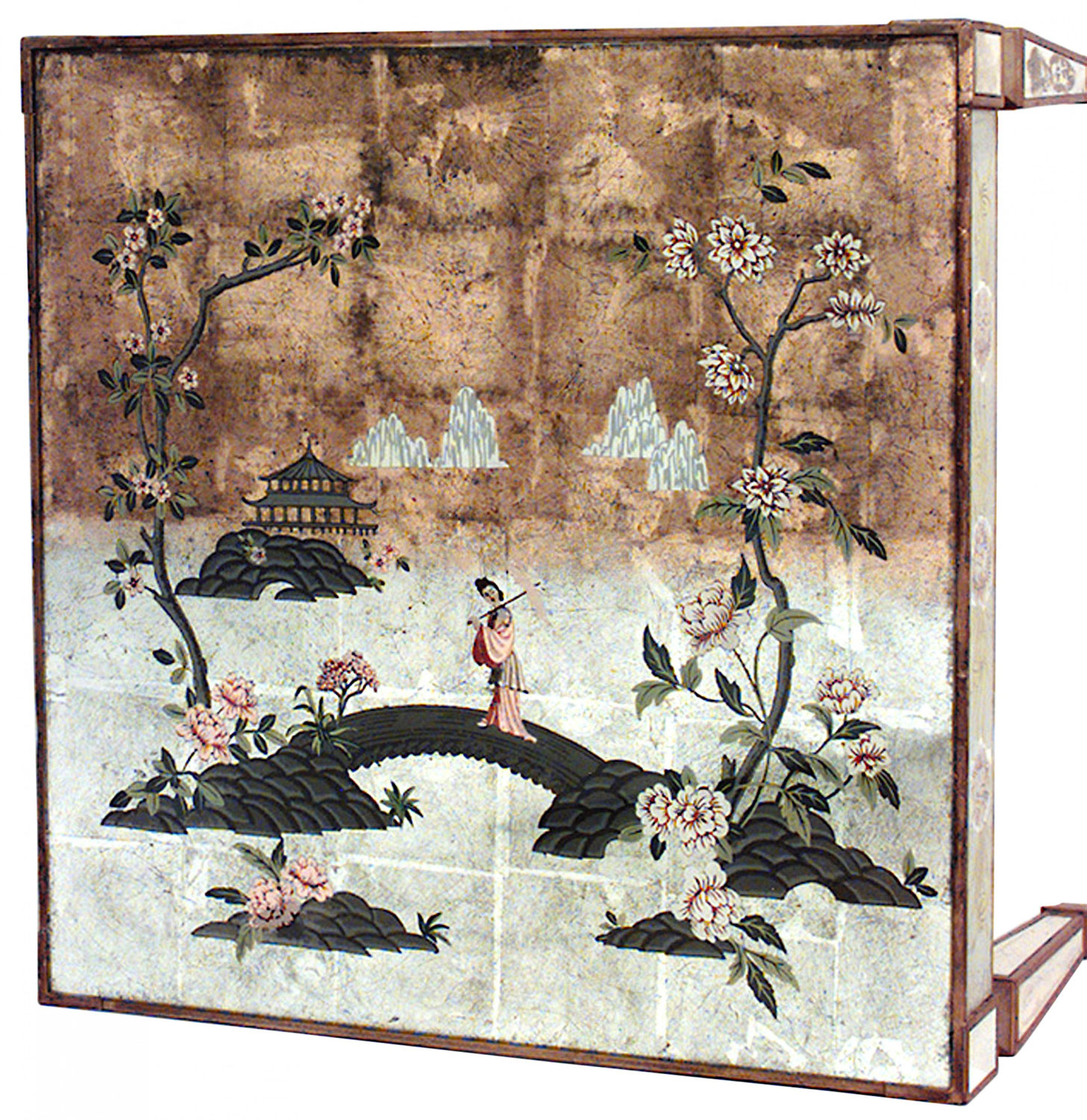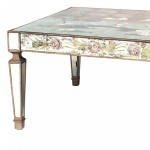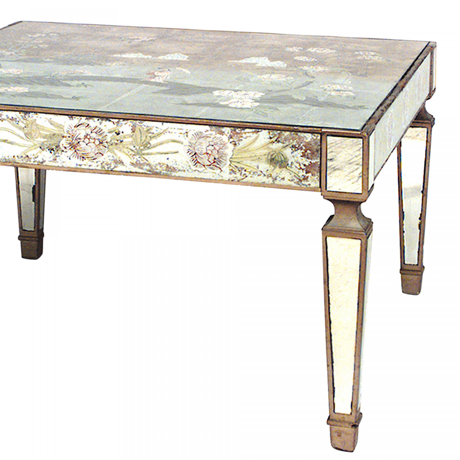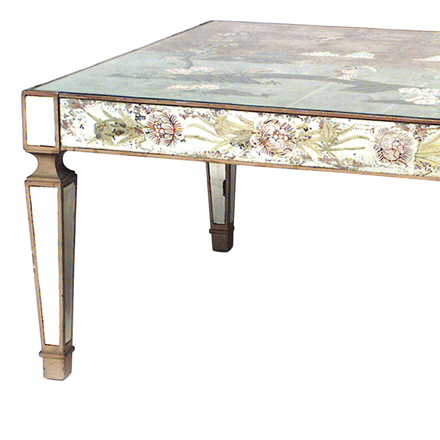Italian (1940s) square coffee table with reverse painted mirrored top featuring Chinoiserie figures and floral decoration.