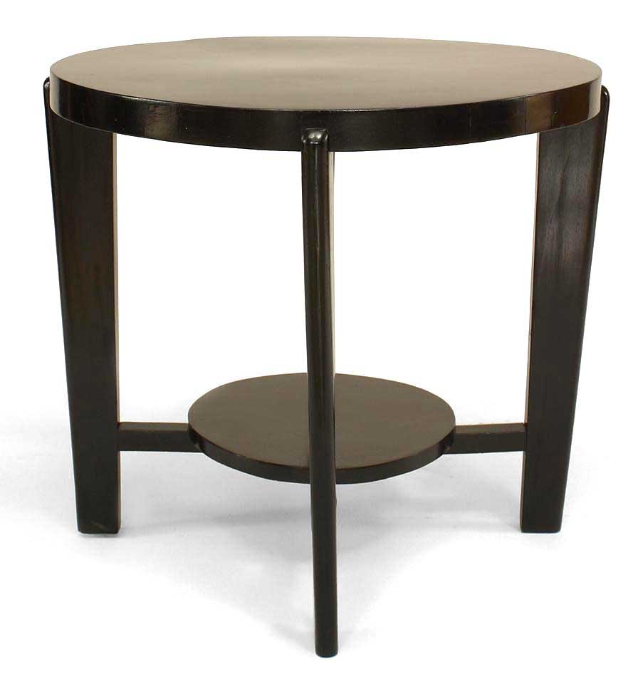 Italian Mid-Century (1940s) ebonized round coffee table with a smaller round shelf supported by a stretcher and four tapered legs..