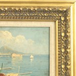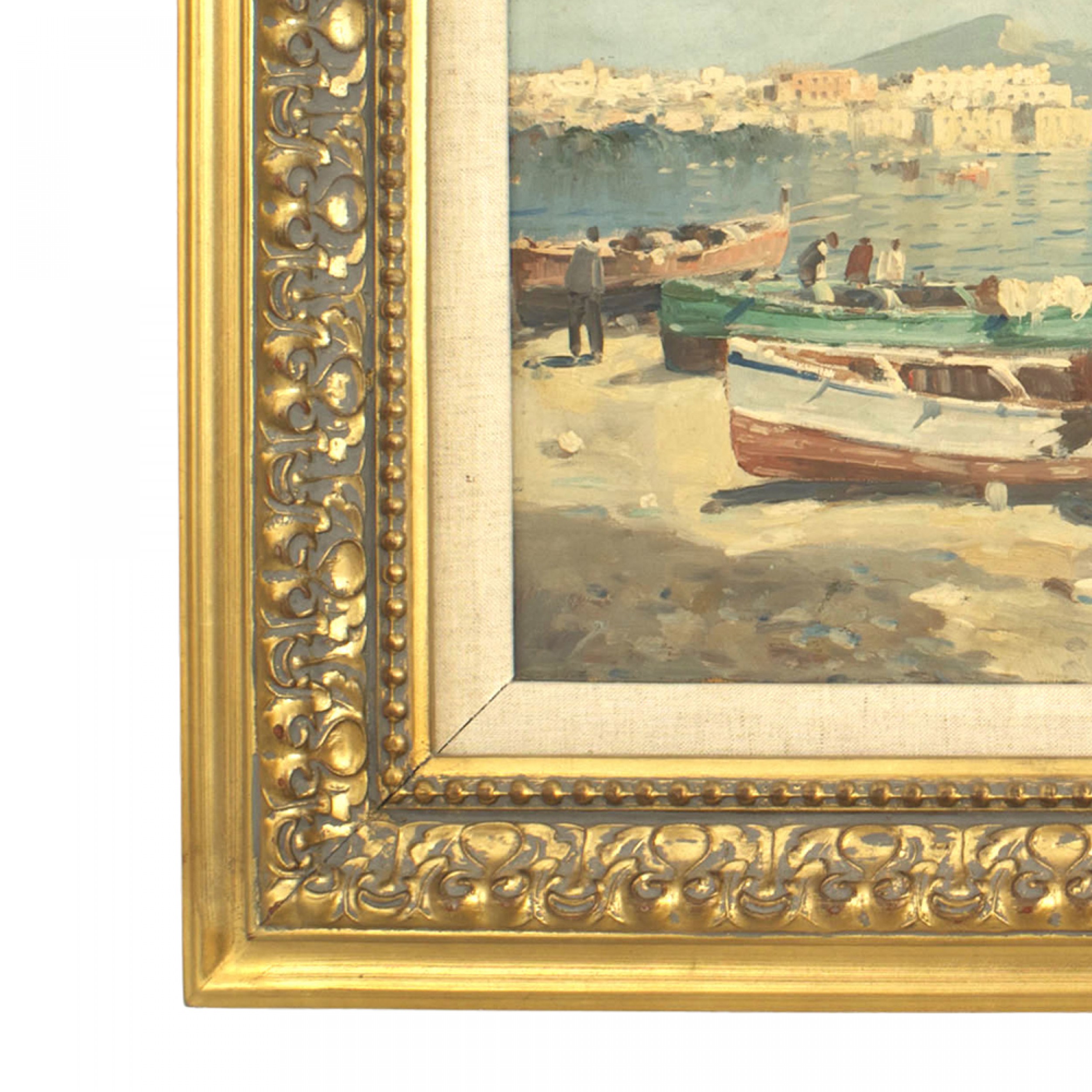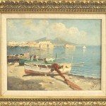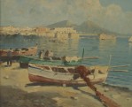 Italian Impressionist style seascape depicting a fishing boat pulled up on to the shore line with mountains in the background.