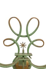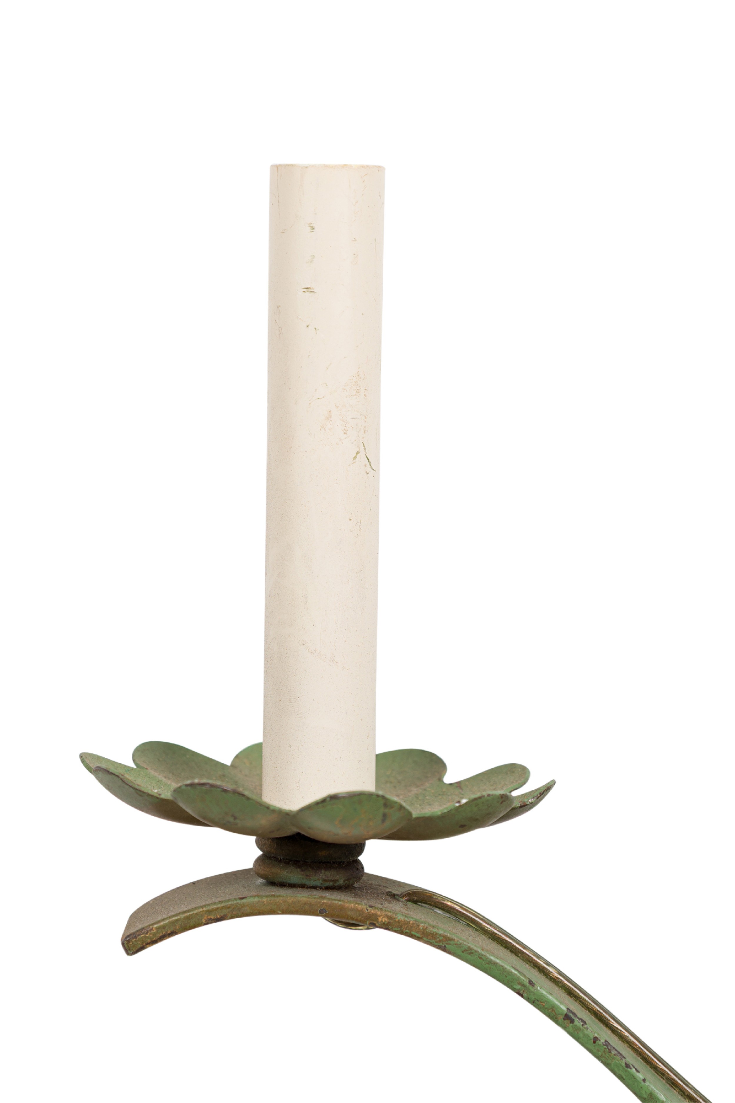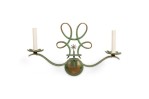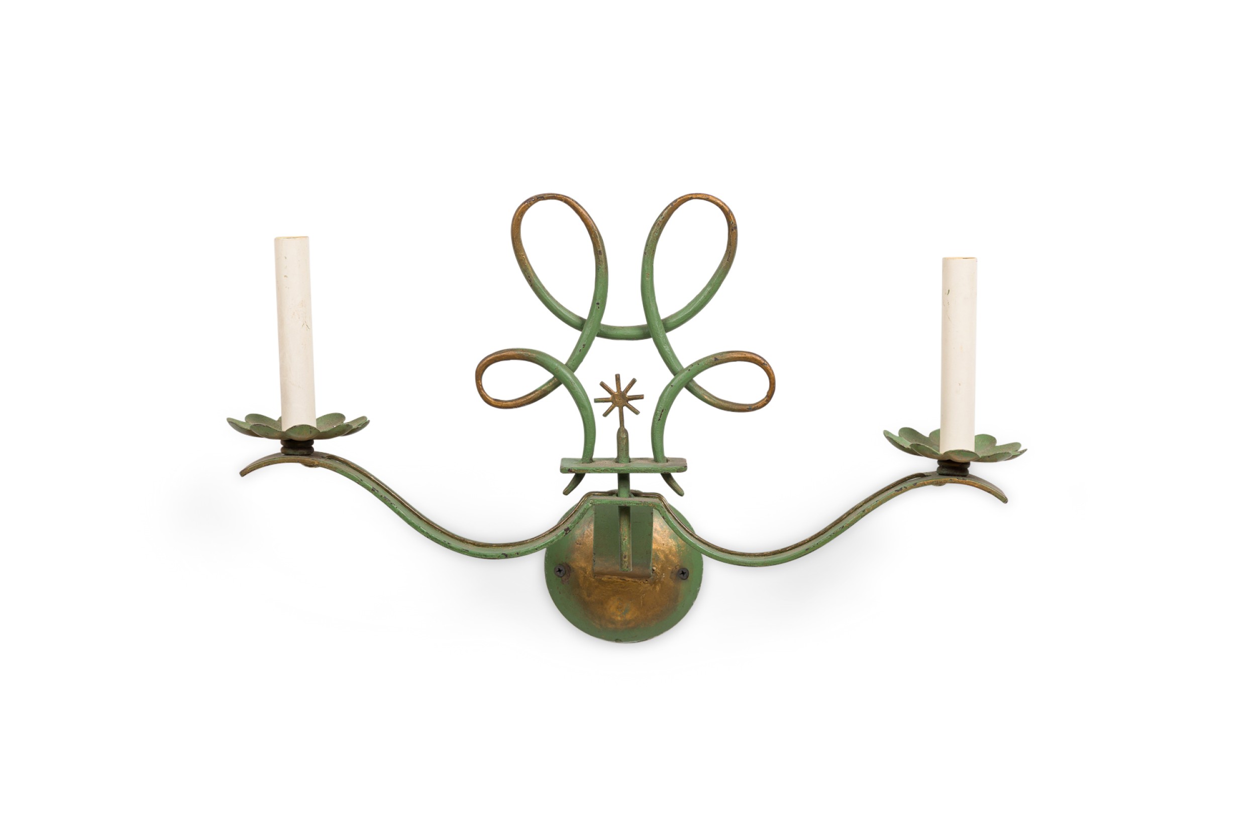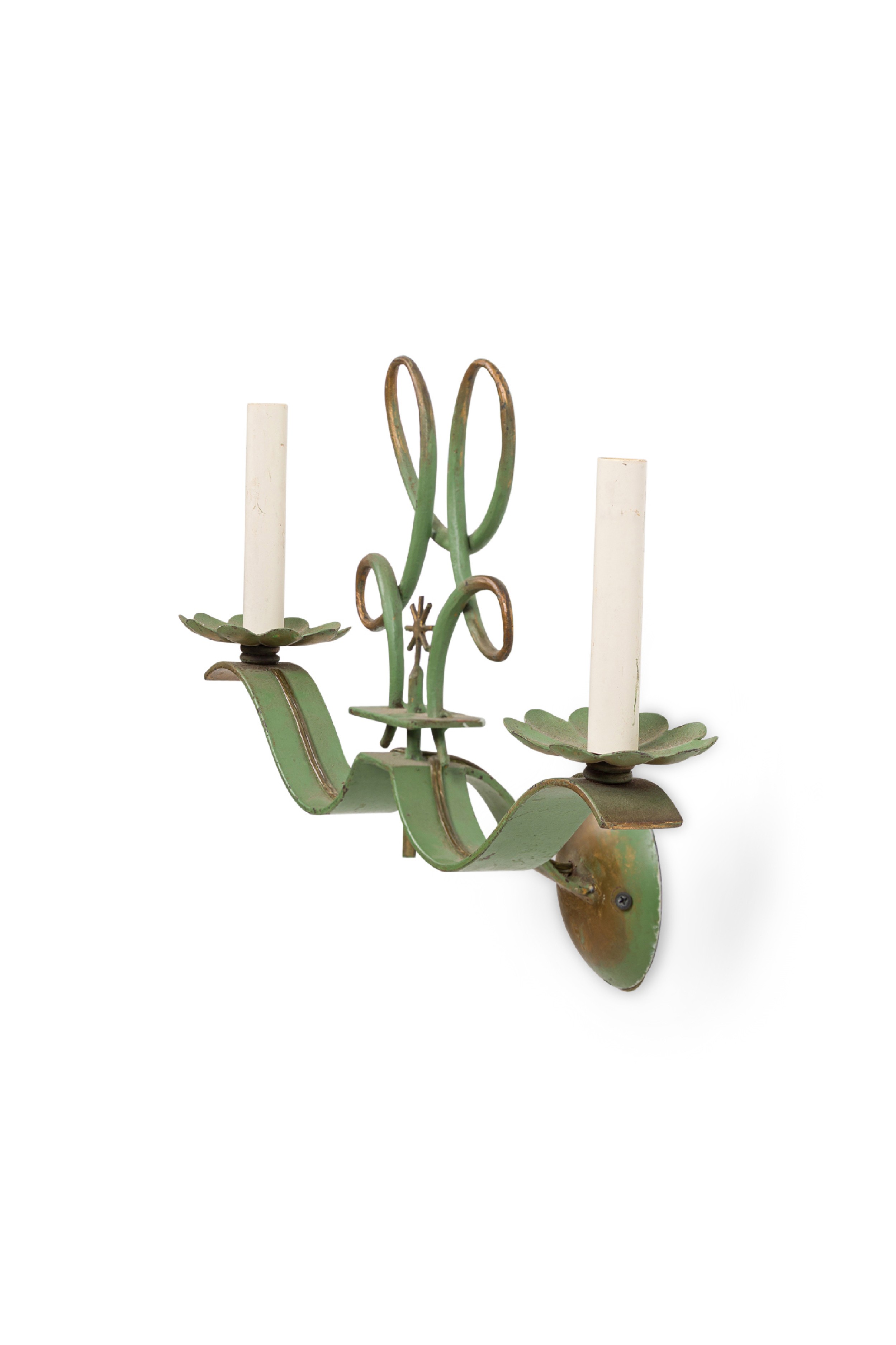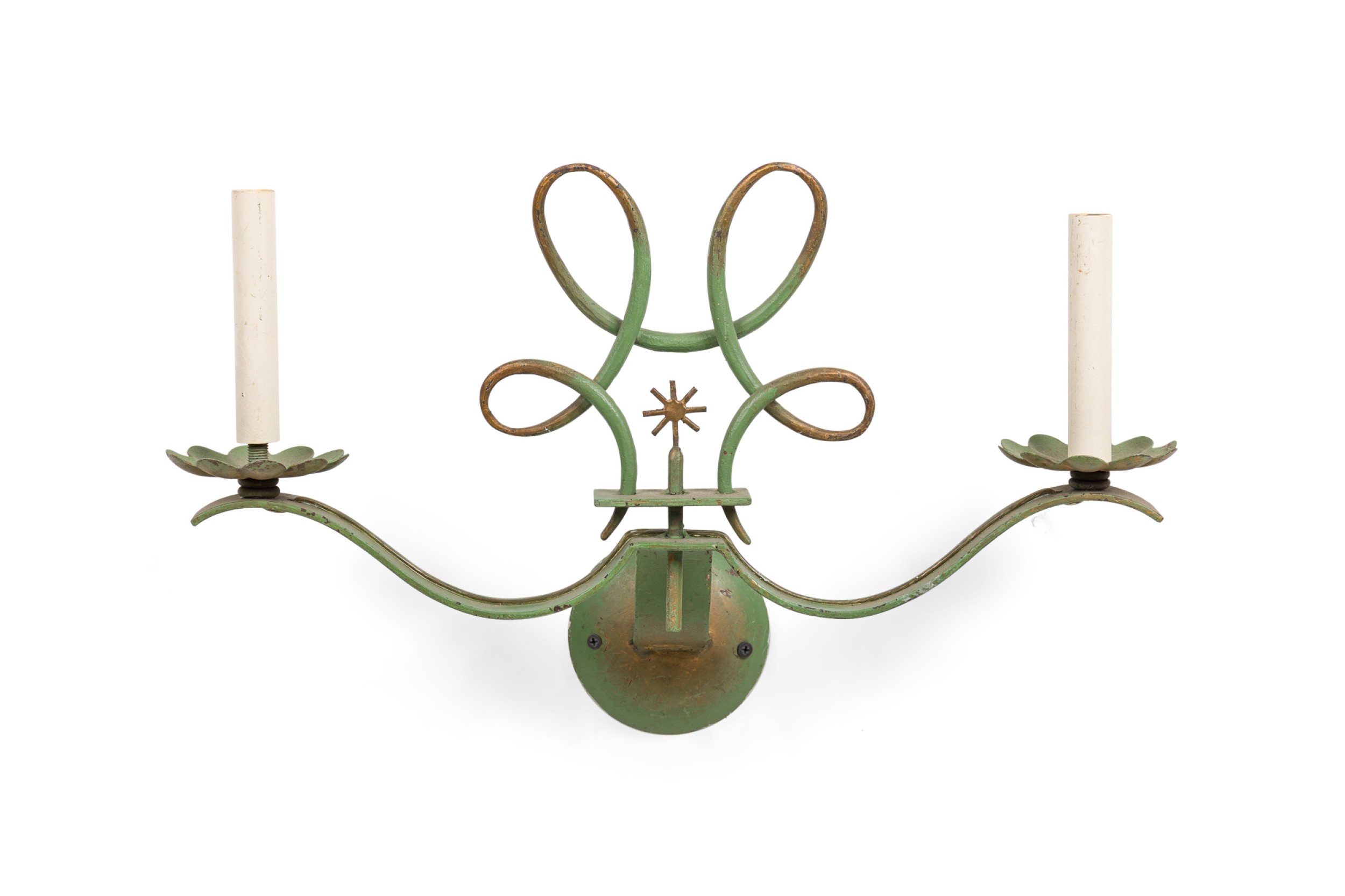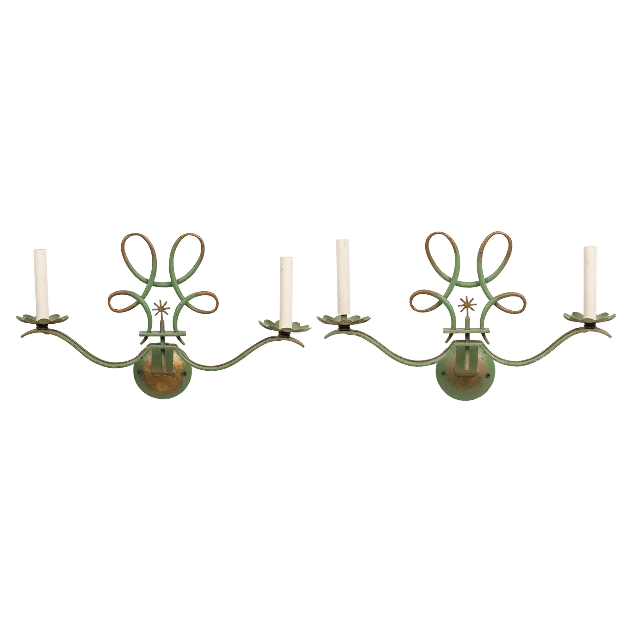 PAIR of French Art Deco green patina metal sconces with 2 scroll arms having floral gold bobeches, under a sprayed open design pediment (style of Leleu). (PRICED AS PAIR)