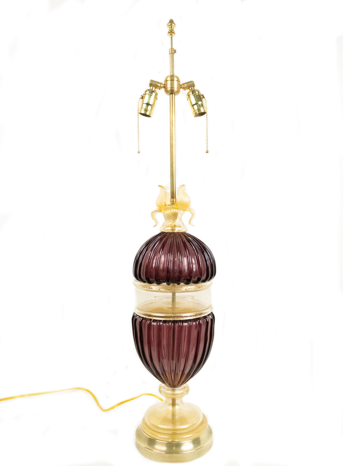 PAIR of Italian Murano Mid-Century style fluted amethyst glass table lamps with a gold dusted glass center section, base and flower top resting on round brass bases (PRICED AS PAIR).