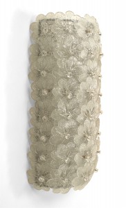 PAIR of Italian Murano wall sconces with ½ round cylindrical form and having clear glass flowers attached to a brass interior frame. Modern