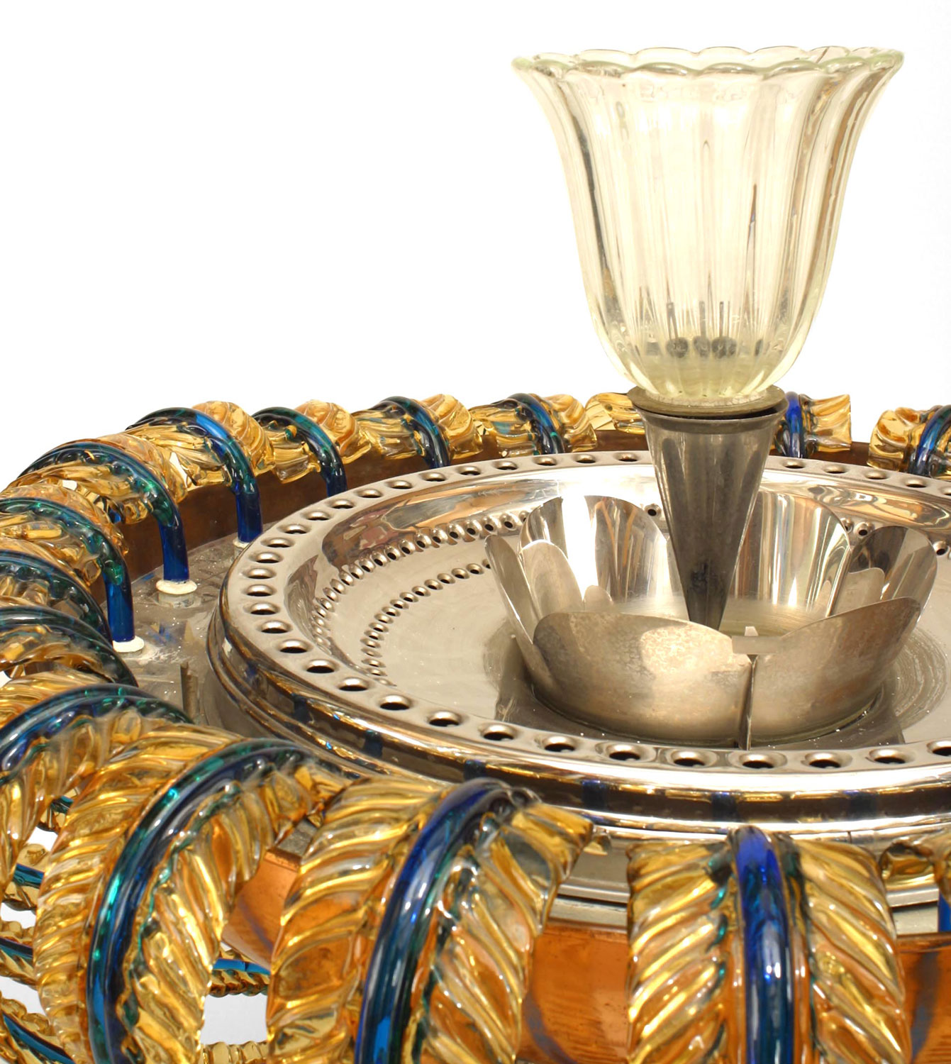 Mid-Century Italian (1940s) Murano metal and glass fountain with 36 amber & blue colored glass feather shaped leaves arranged around a central clear glass fluted bowl, has minor damage, please inquire..