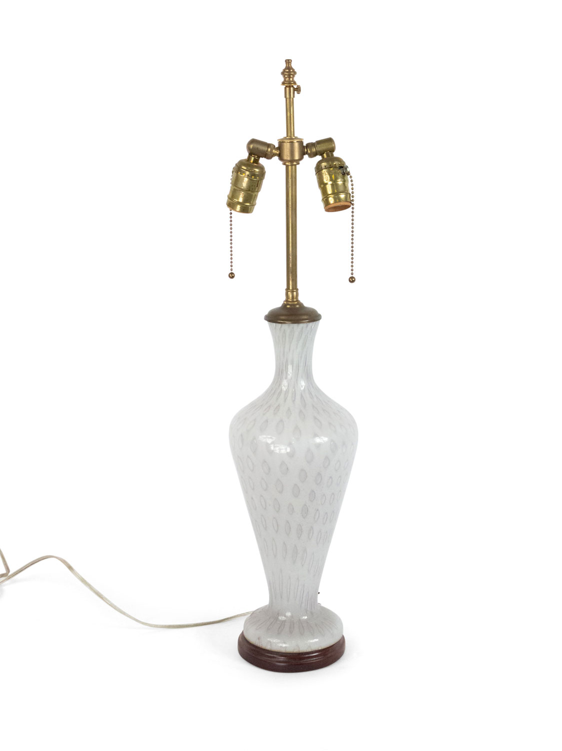 Italian Murano white with a purple shading glass table lamp with internal bubble design on a wood base.