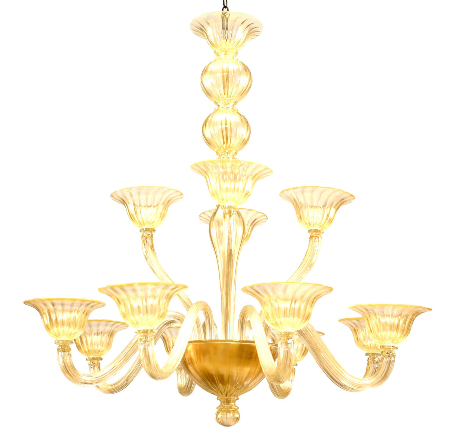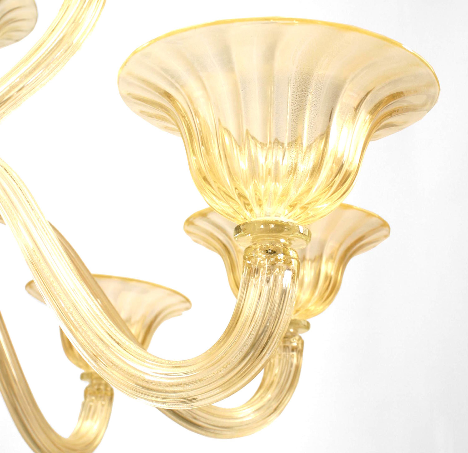 2 Italian Murano "SOMMERSO" gold dusted fluted glass 2 tiered 12 arm chandeliers with S shaped arms holding large cup shade with finial bottom (PRICED EACH)