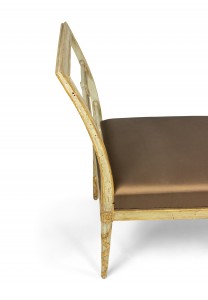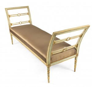 Italian Neo-classic (18th Century) celadon painted bench with gilt trim and open side arms with a raised inset set cushion and ribbon carved fluted legs.