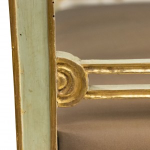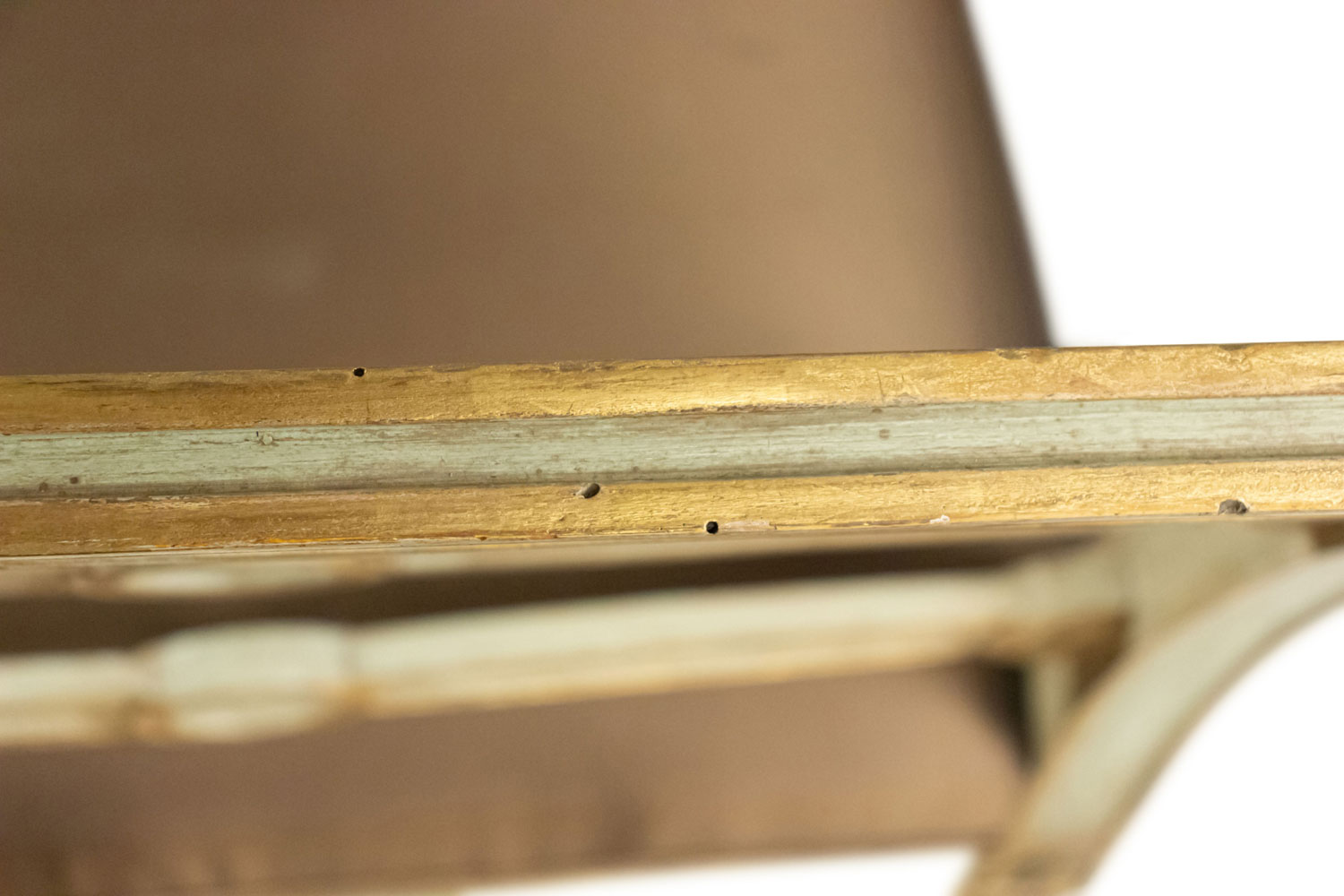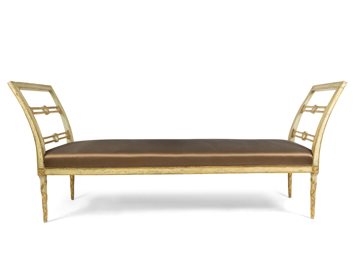 Italian Neo-classic (18th Century) celadon painted bench with gilt trim and open side arms with a raised inset set cushion and ribbon carved fluted legs..
