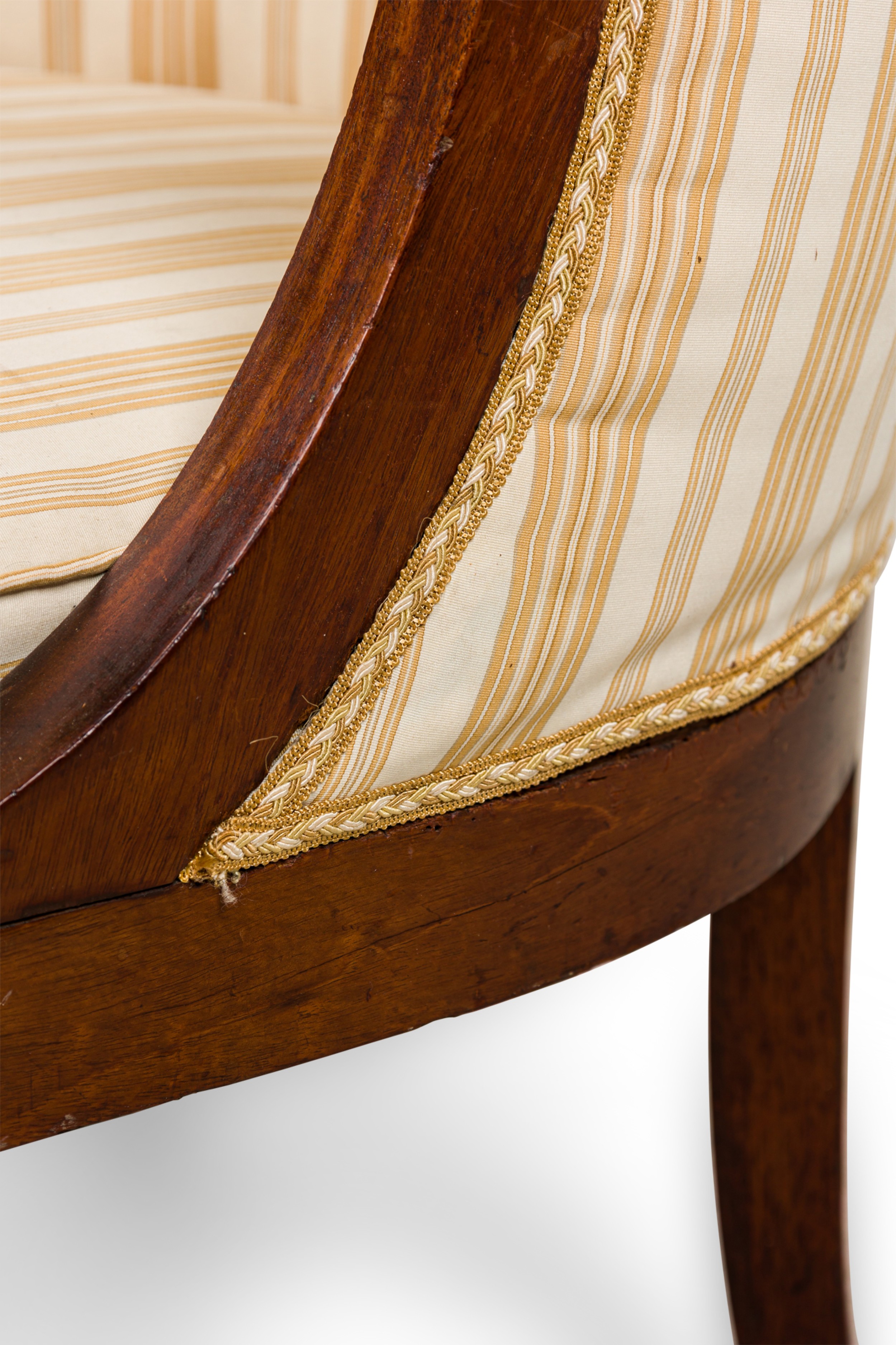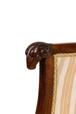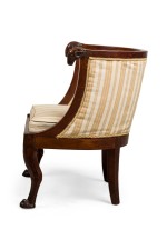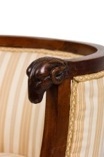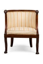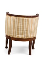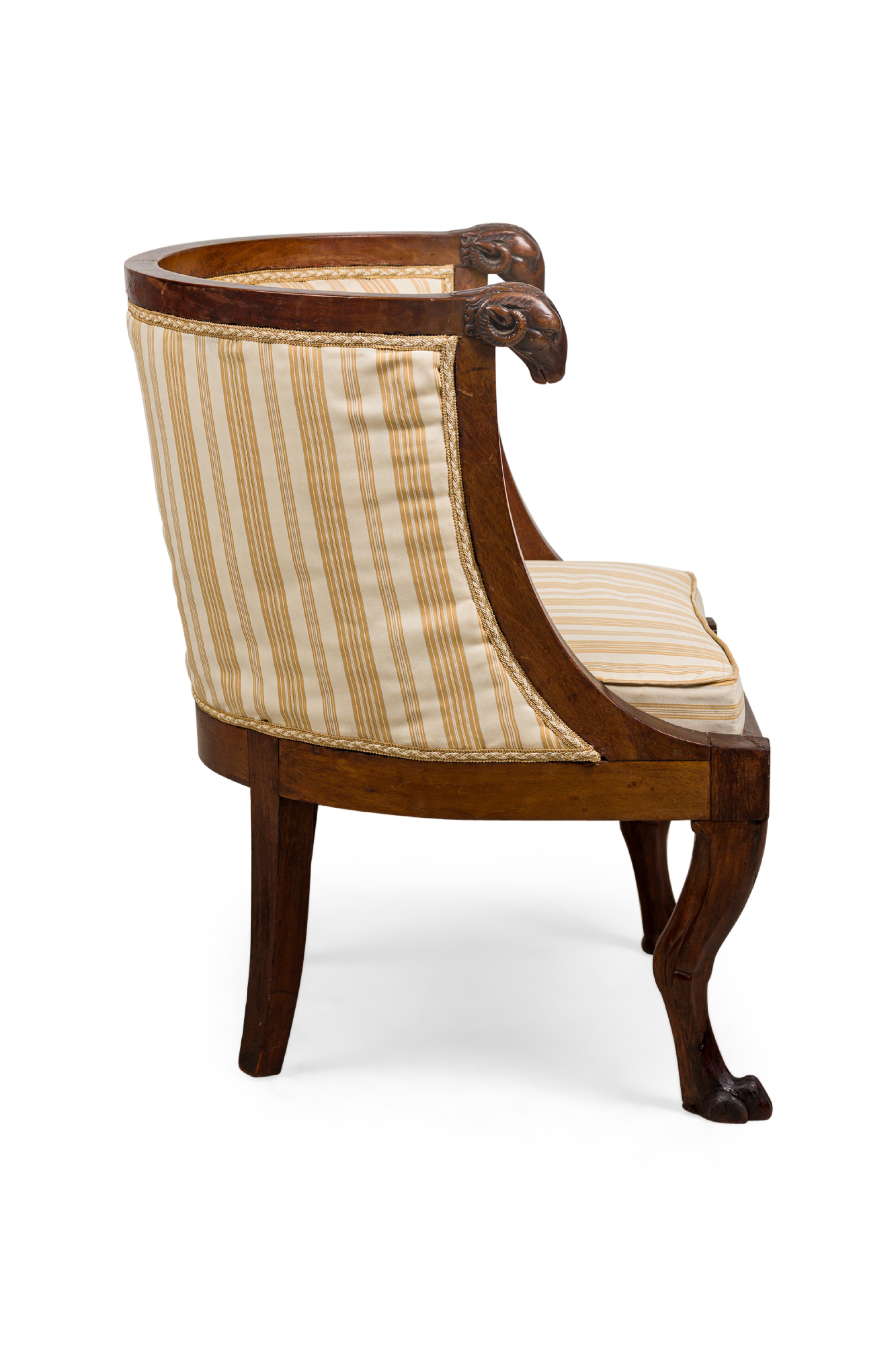 Italian Neo-classic (early 19th Century) round back tub back form armchair with lion heads and claw feet having a striped off-white and yellow design upholstered back and seat cushion