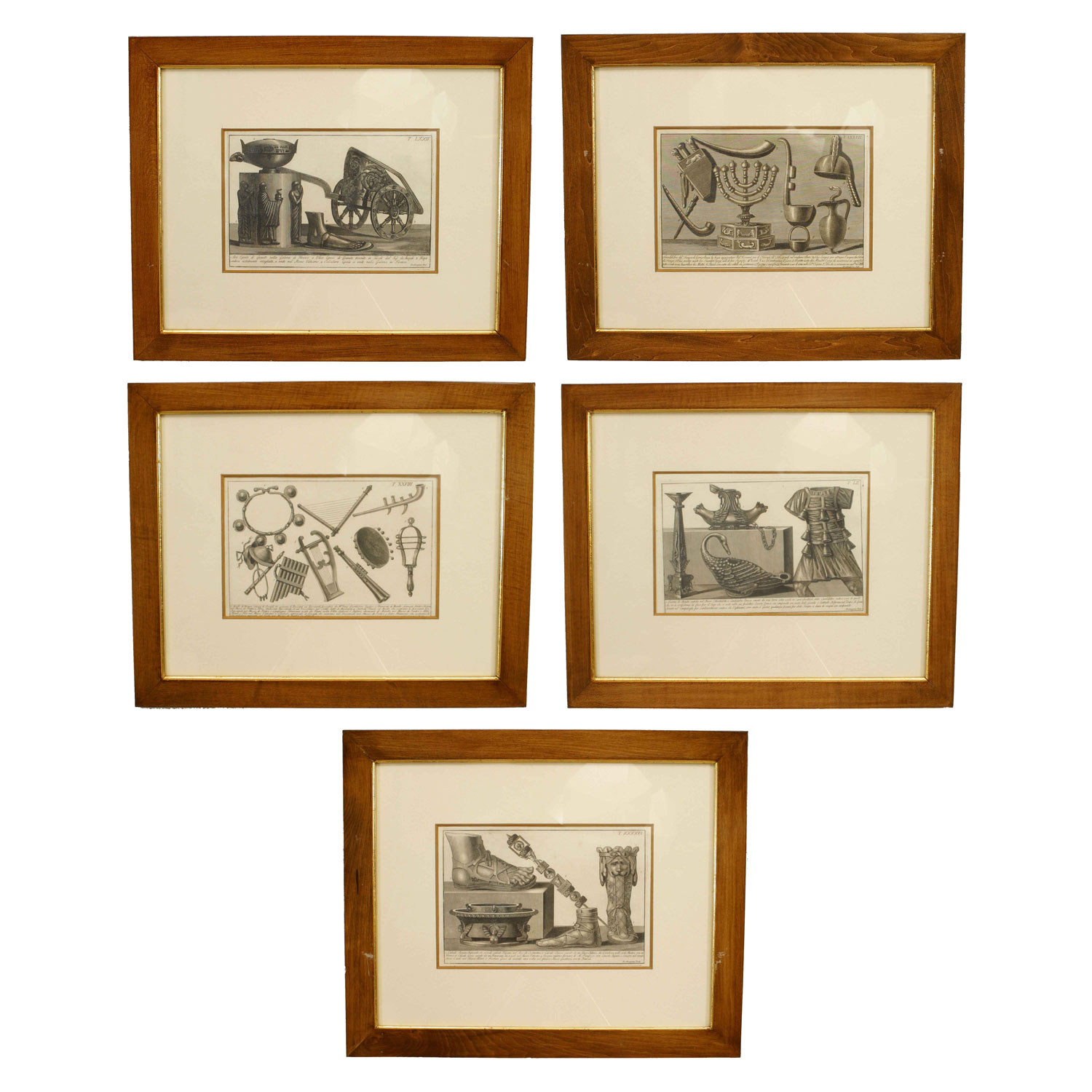 Italian Neo-classic style print of various military arms, armor, and objects matted in stained walnut frame (part of a set of 15; associated pieces: 040101A-040101O)