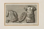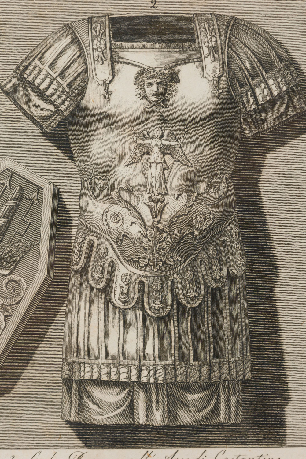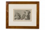 Italian Neo-classic style print of various military arms, armor, and objects matted in stained walnut frame (part of a set of 15; associated pieces: 040101A-040101O).