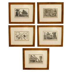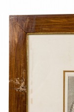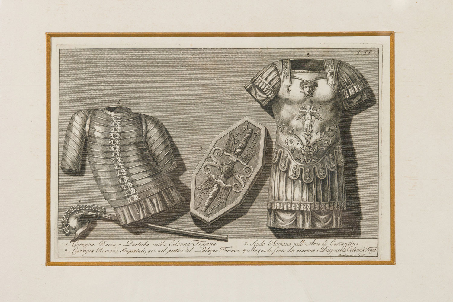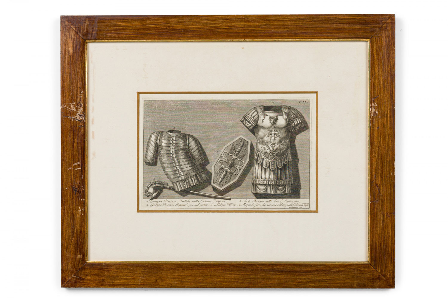 Italian Neo-classic style print of various military arms, armor, and objects matted in stained walnut frame (part of a set of 15; associated pieces: 040101A-040101O)