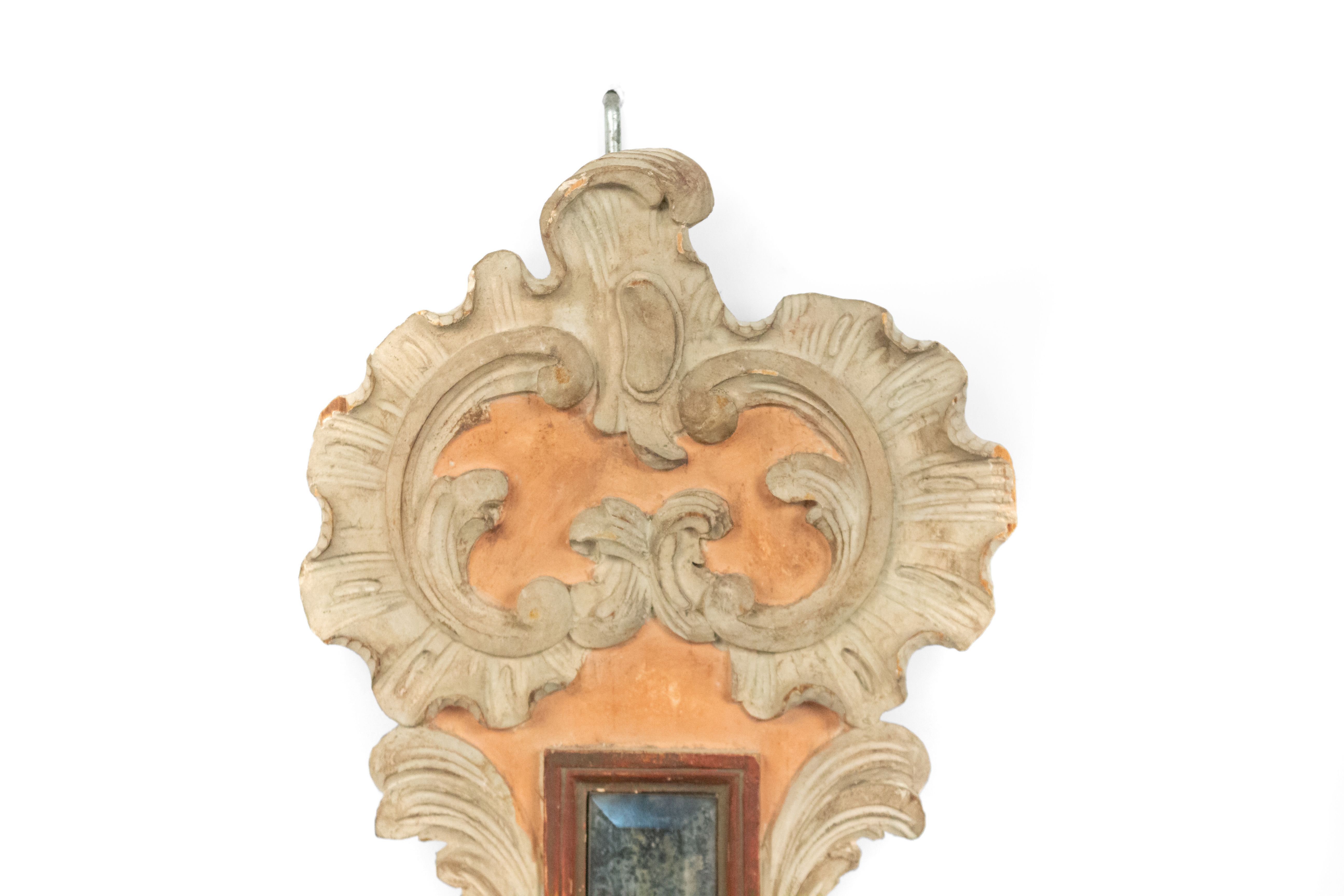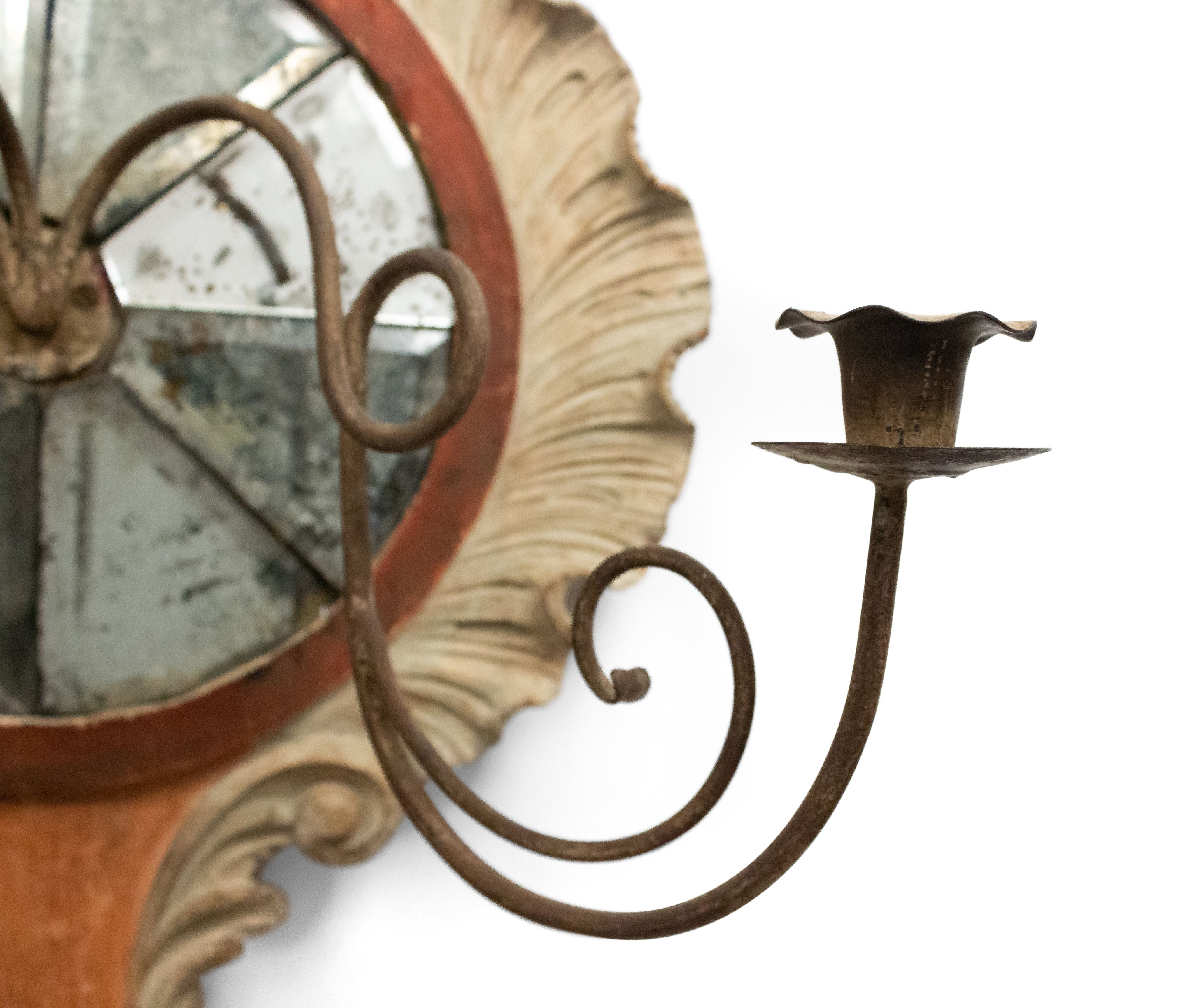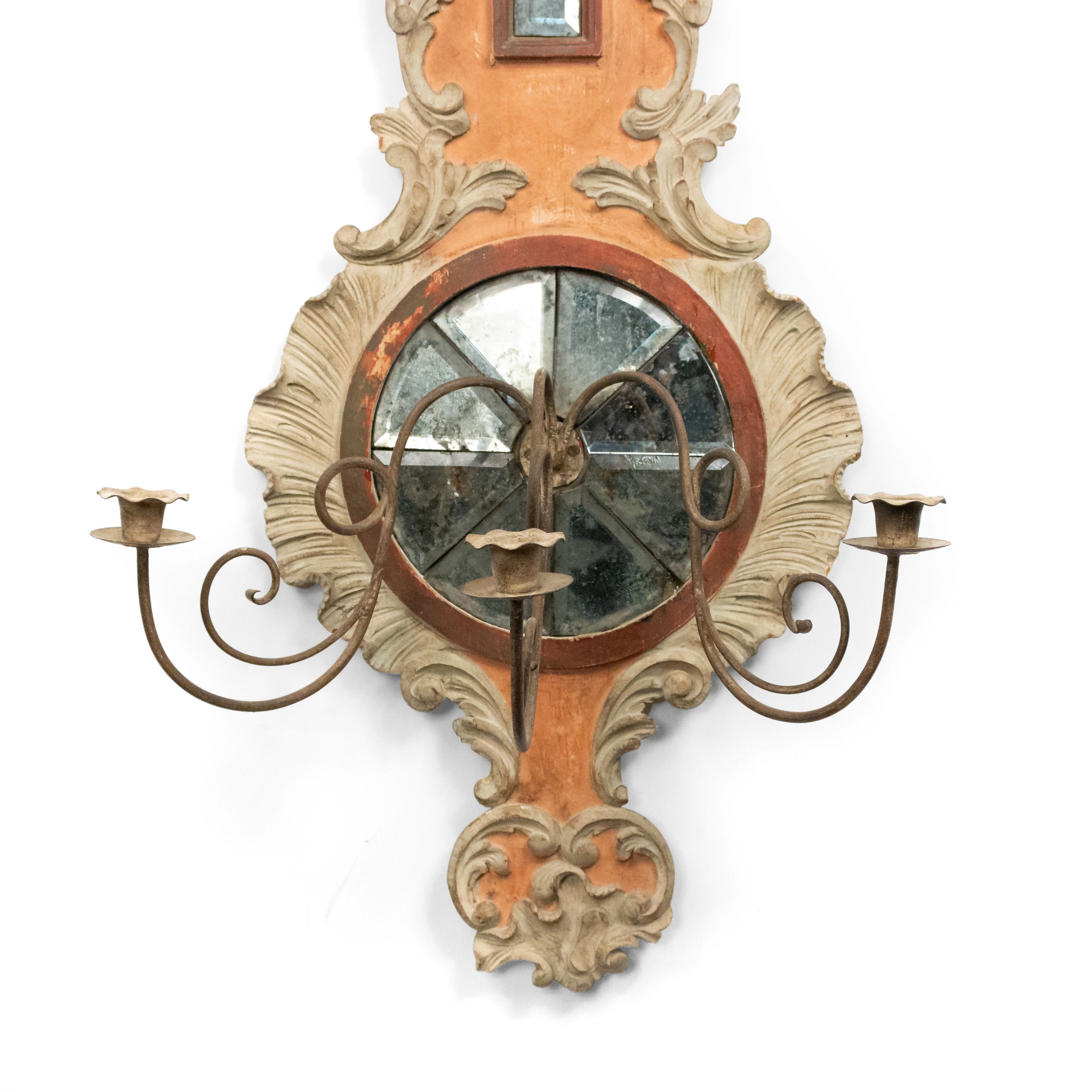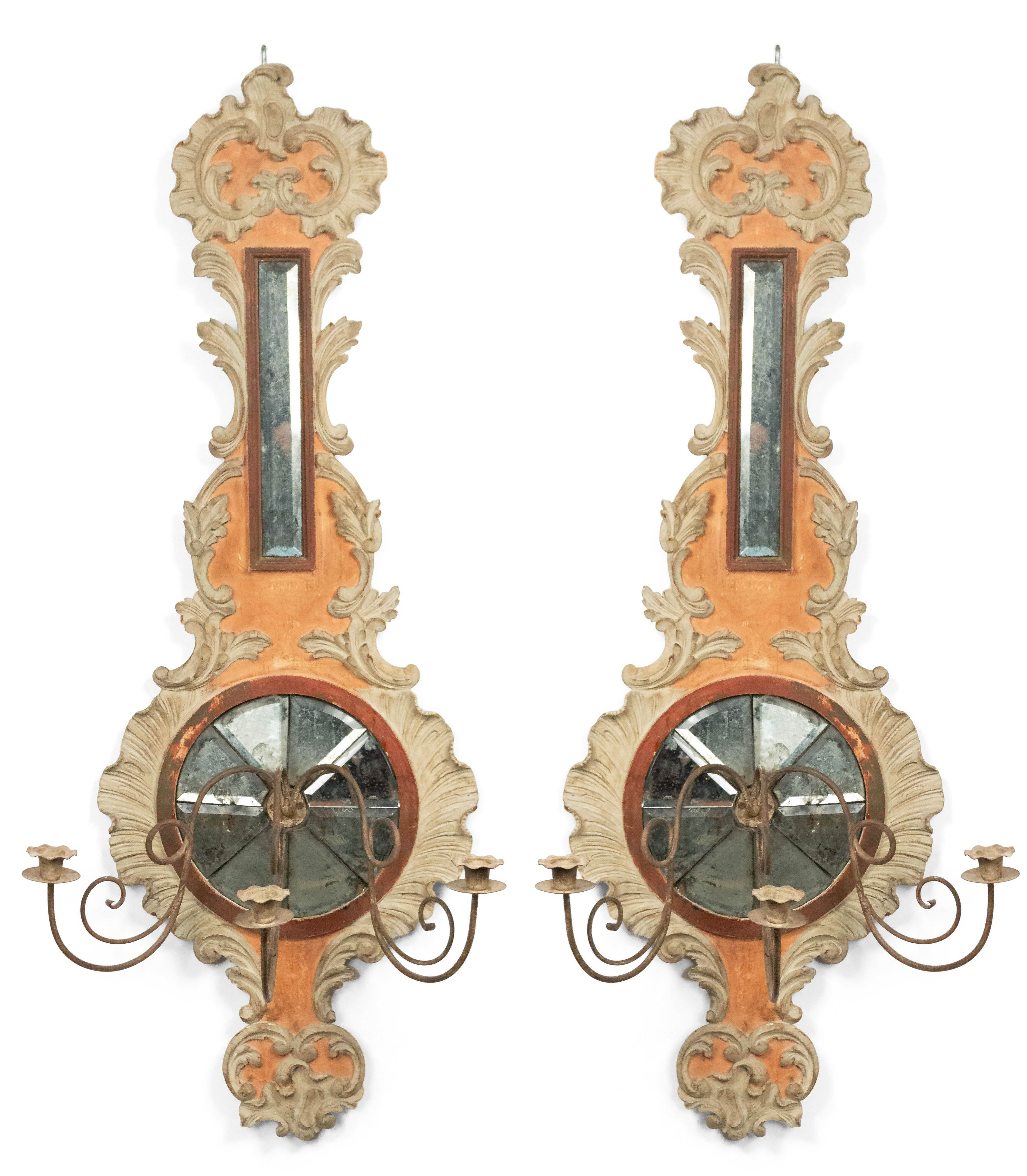 PAIR of Italian Neoclassic-style (19/20th Century) carved wood wall sconces with three patinated brass arms, beige and peach painted and carved wooden barometer-shaped back plates and mirrored detail. (PRICED AS PAIR).
