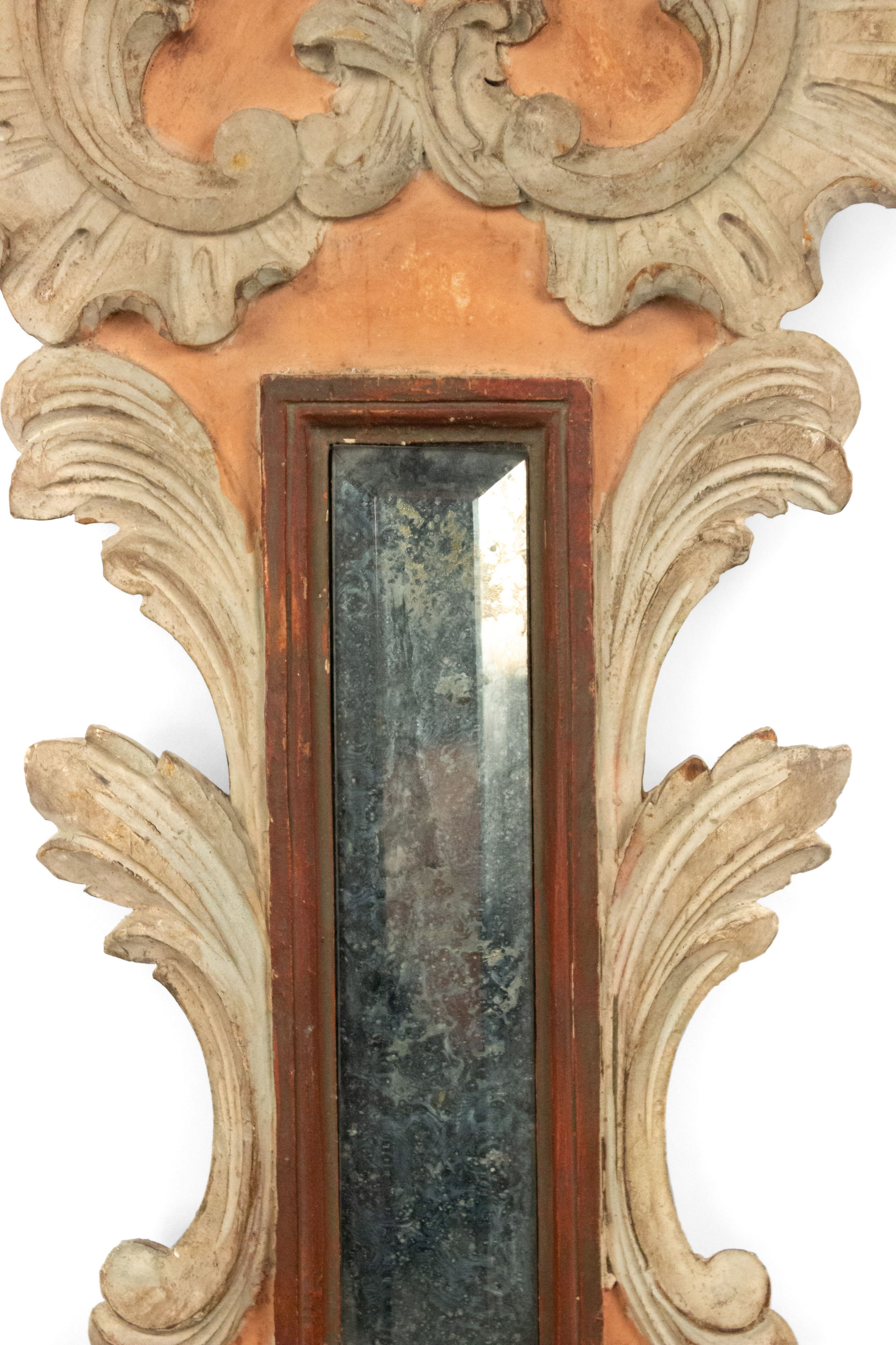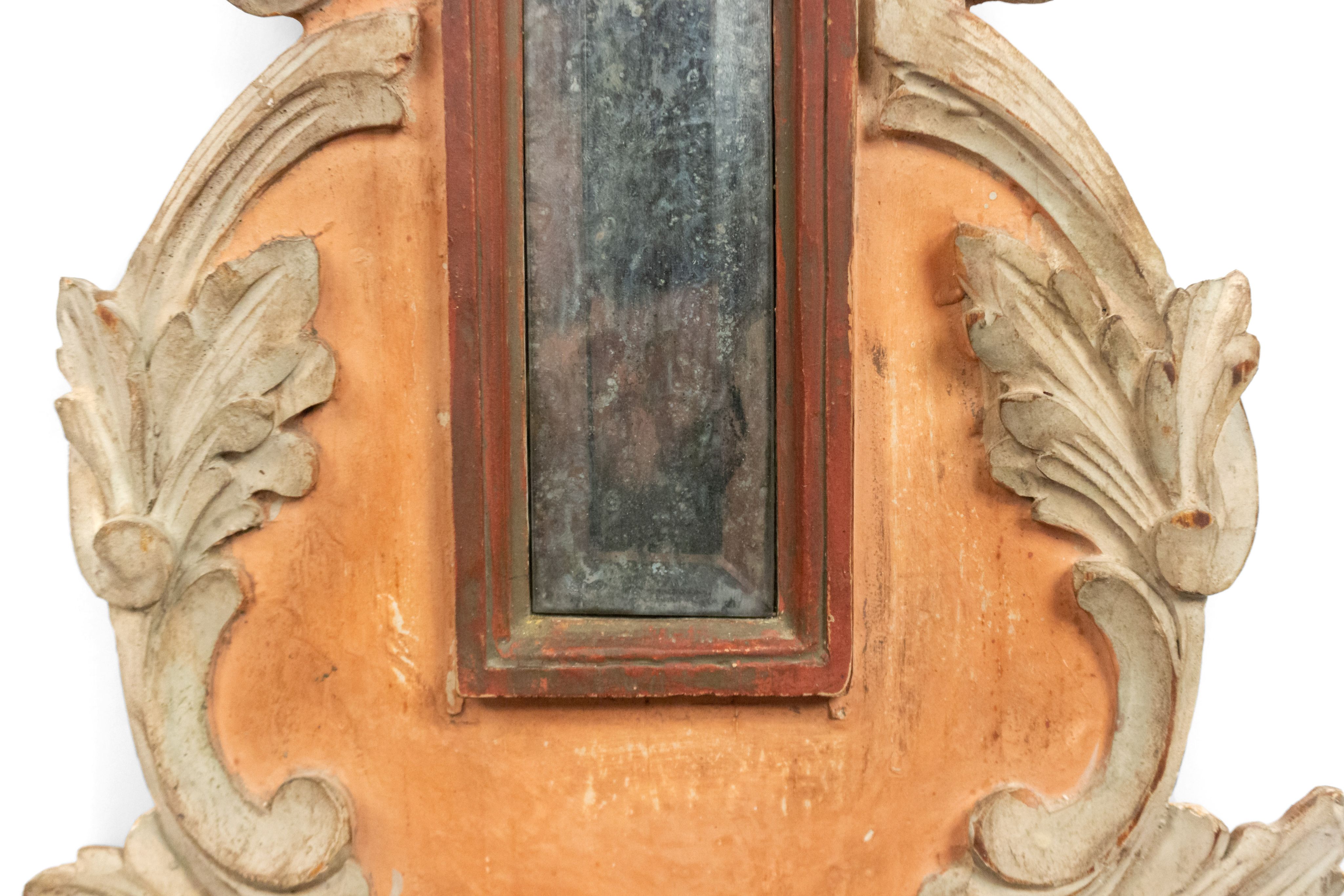 PAIR of Italian Neoclassic-style (19/20th Century) carved wood wall sconces with three patinated brass arms, beige and peach painted and carved wooden barometer-shaped back plates and mirrored detail. (PRICED AS PAIR)