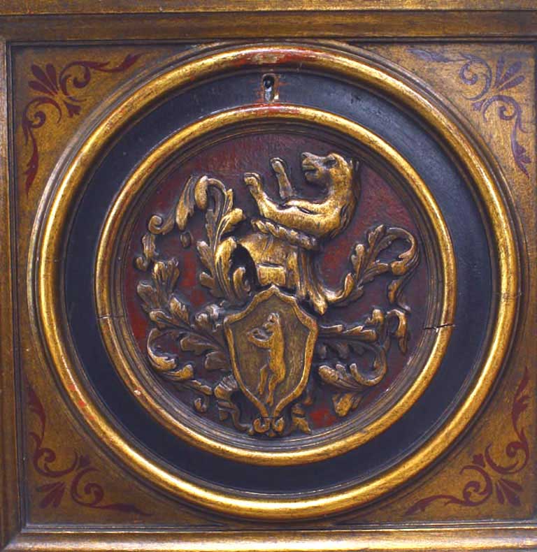 Italian Renaissance style (late 19th Century) polychromed and parcel gilt chest on a stand with round painted panels and faux marble top..
