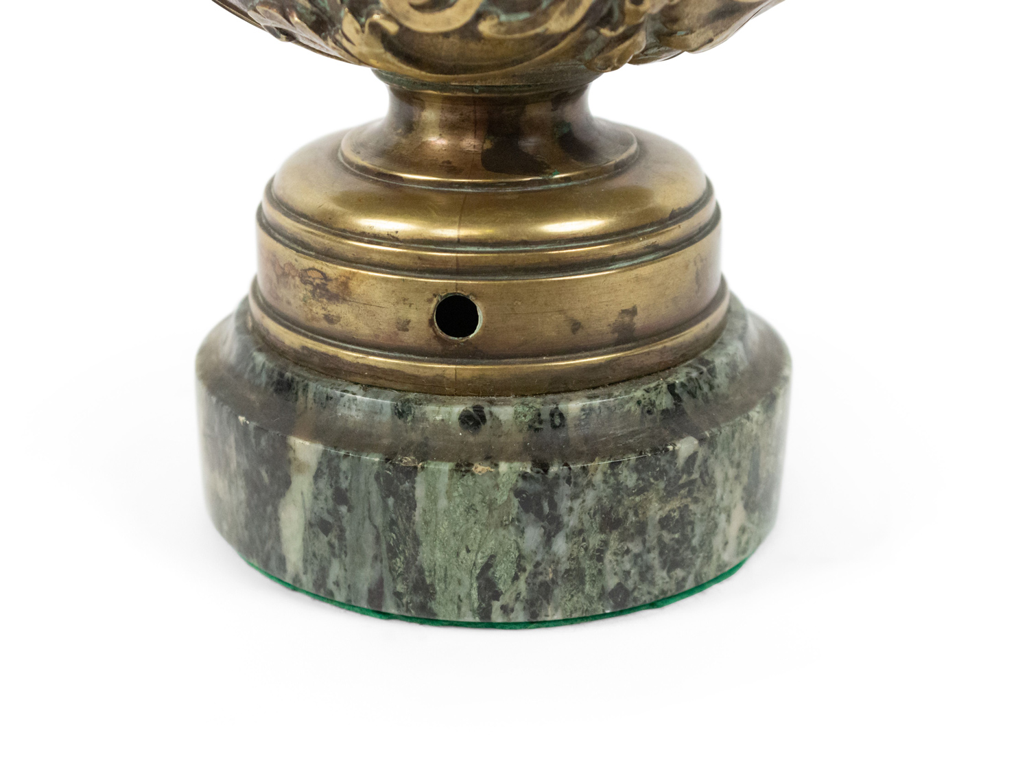 Italian Renaissance style (19th Cent) bronze aladdin lamp with head in relief on round green marble base.