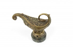 Italian Renaissance style (19th Cent) bronze aladdin lamp with head in relief on round green marble base..