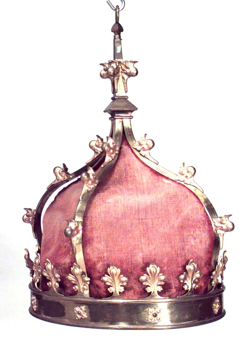 Italian Renaissance-style (19/20th Century) bronze dore oval crown shaped chandelier with fleur-de-lis finial and red velvet upholstery..
