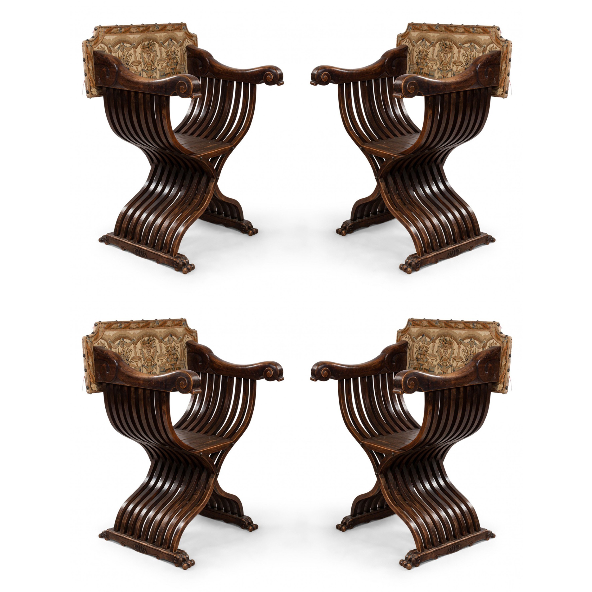 SET of 4 Italian Renaissance style (19th Cent) walnut Savanarola style arm chairs with slatted sides & legs and tapestry backs with carved scroll arms & claw feet.