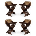 SET of 4 Italian Renaissance style (19th Cent) walnut Savanarola style arm chairs with slatted sides & legs and tapestry backs with carved scroll arms & claw feet
