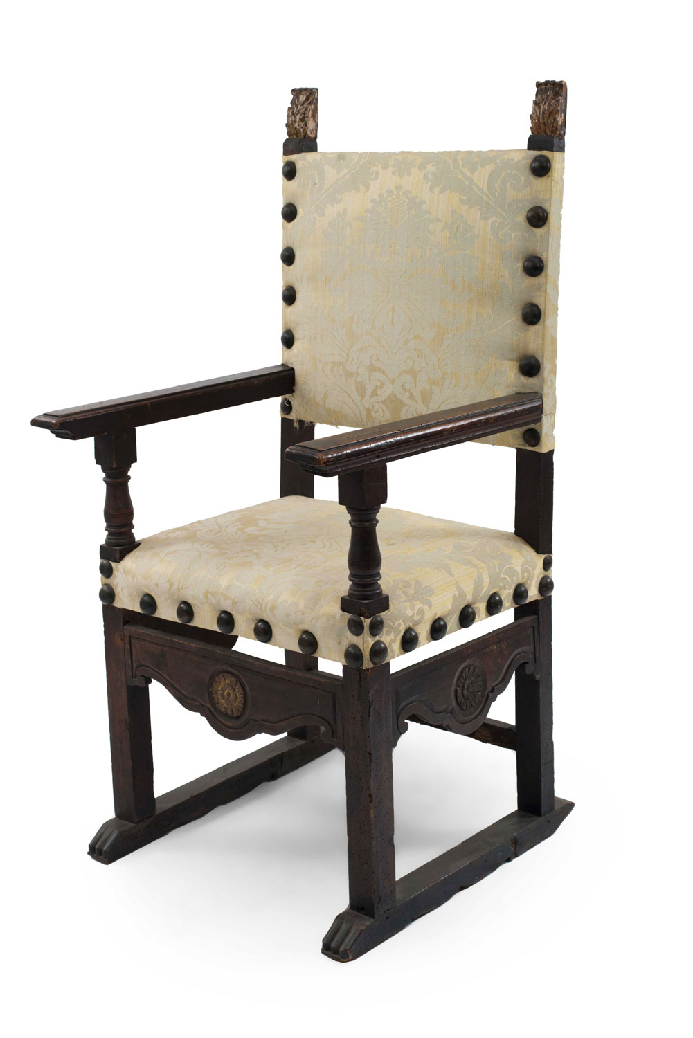 Italian Renaissance walnut throne style arm chair with gilt carved ears on back and Fortuny upholstered seat and back with large metal nail heads. (replaced side rails)