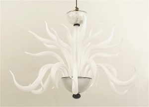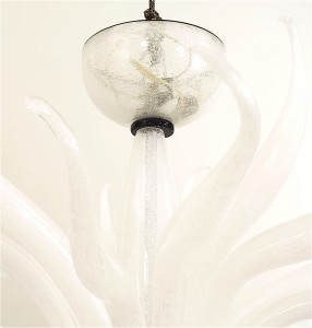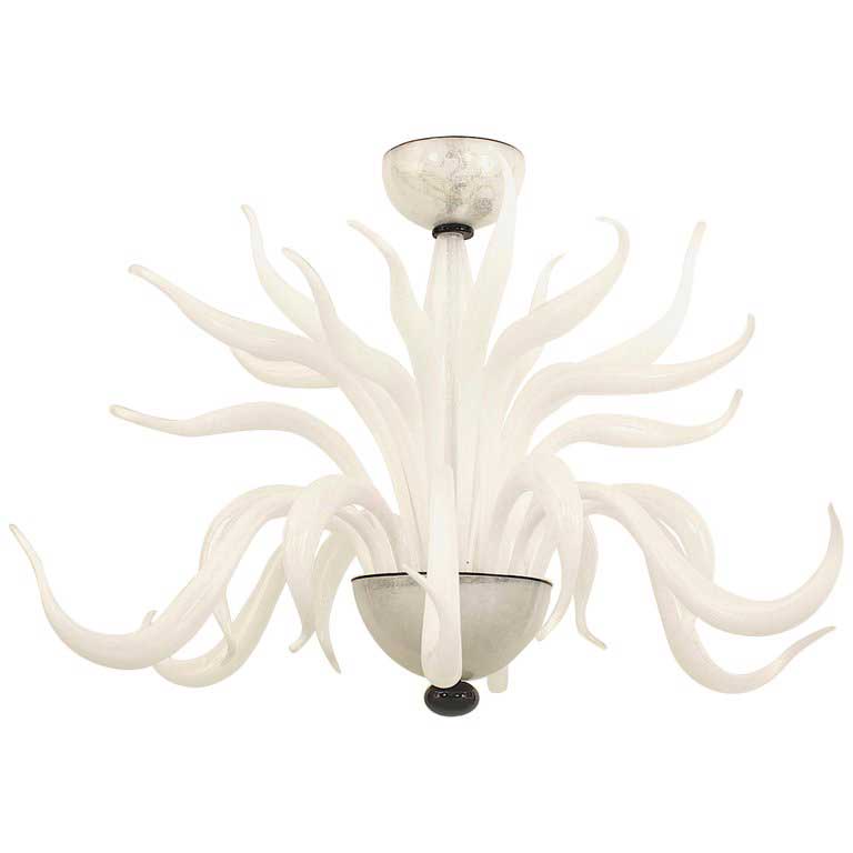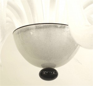 Post-War Design Italian Venetian Murano textured white glass chandelier with multiple scroll arms emanating from a center shaft with a bowl bottom having a black glass finial & trim..