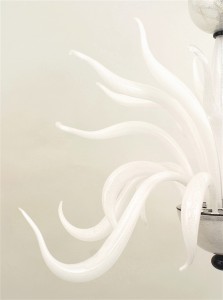 Post-War Design Italian Venetian Murano textured white glass chandelier with multiple scroll arms emanating from a center shaft with a bowl bottom having a black glass finial & trim.