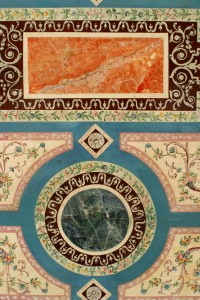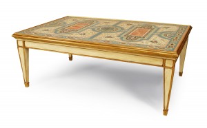 Italian Venetian-style rectangular coffee table with a pair of 18th Century decoratively painted panels inset in a modern off-white and gilt trimmed base with tapered square legs..